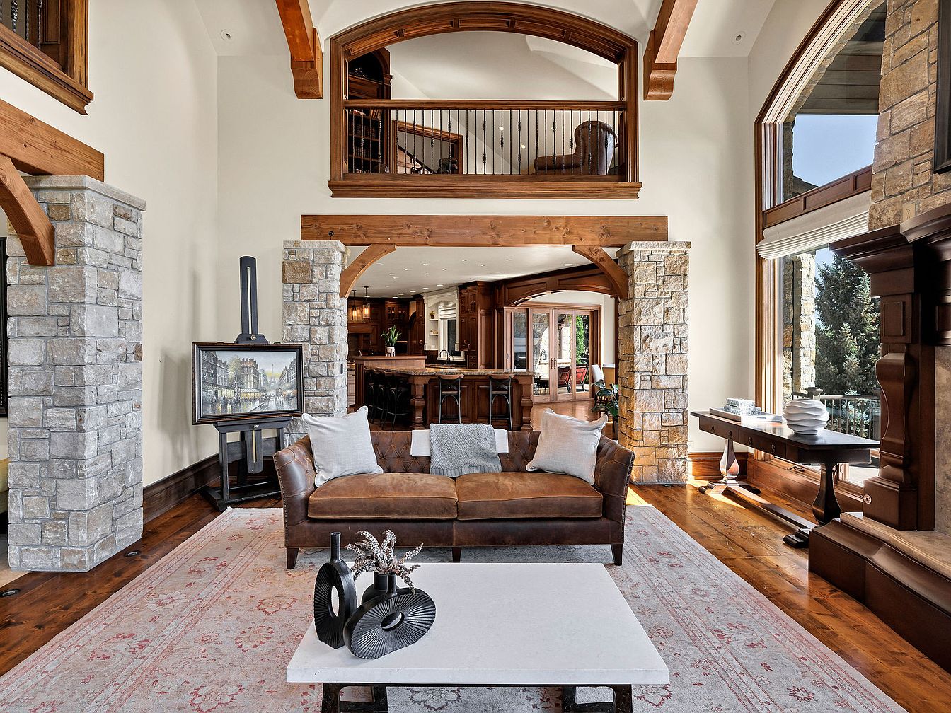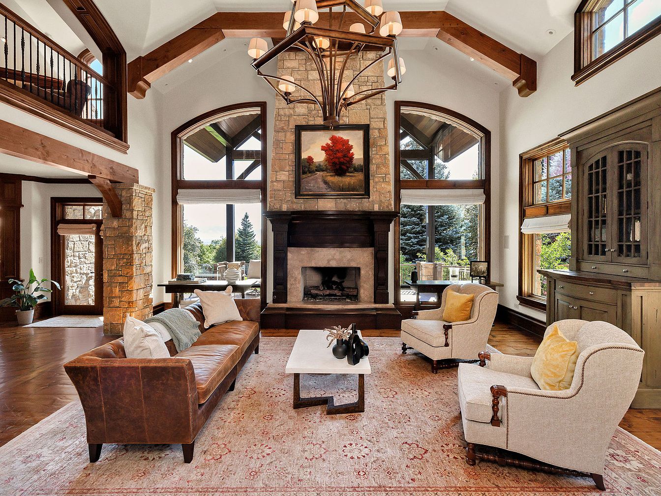 This spacious living room boasts stunning architectural features with soaring ceilings and exposed wooden beams, creating a grand yet inviting atmosphere. The mix of natural stone and rich wood accents adds warmth and character. A plush, leather sofa sits atop a soft area rug, complemented by modern decor pieces that enhance the room’s charm. Large windows flood the space with natural light, framing serene outdoor views and bridging the indoor and outdoor areas. A cozy fireplace and a well-appointed bar area invite family gatherings, making this living room not only stylish but also functional for everyday living.