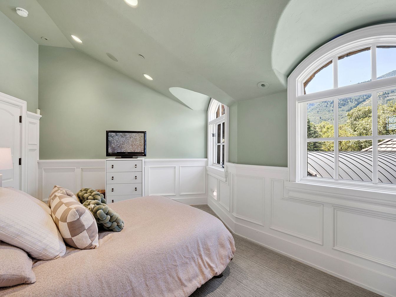 This serene master bedroom features a soothing light green palette that enhances the spacious feel, complemented by elegant architectural details like crown molding. A plush bed draped in soft linens invites relaxation, while carefully arranged decorative pillows add a touch of cozy elegance. The layout maximizes natural light streaming through oversized arched windows, offering breathtaking views of the outdoors. A stylish dresser blends functionality with aesthetics, and the addition of a wall-mounted television ensures convenience. With its family-friendly features and calming design, this room provides a perfect haven for rest and rejuvenation.