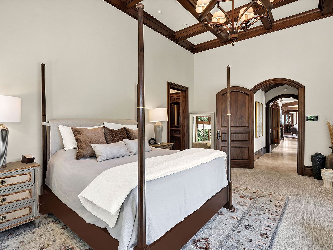 This master bedroom combines elegance with comfort, featuring a prominent four-poster bed dressed with soft linens and an array of plush pillows. The warm wood tones of the canopy and furniture contrast beautifully with the neutral wall color, enhancing the room’s serene ambiance. Illuminated by stylish lamps, cozy reading nooks invite relaxation. Architectural details include arched doorways and a tray ceiling adorned with chic lighting, adding character and depth. A tastefully patterned area rug anchors the space while offering a touch of warmth. Natural light pours in from nearby windows, promoting an inviting, tranquil atmosphere perfect for rest.