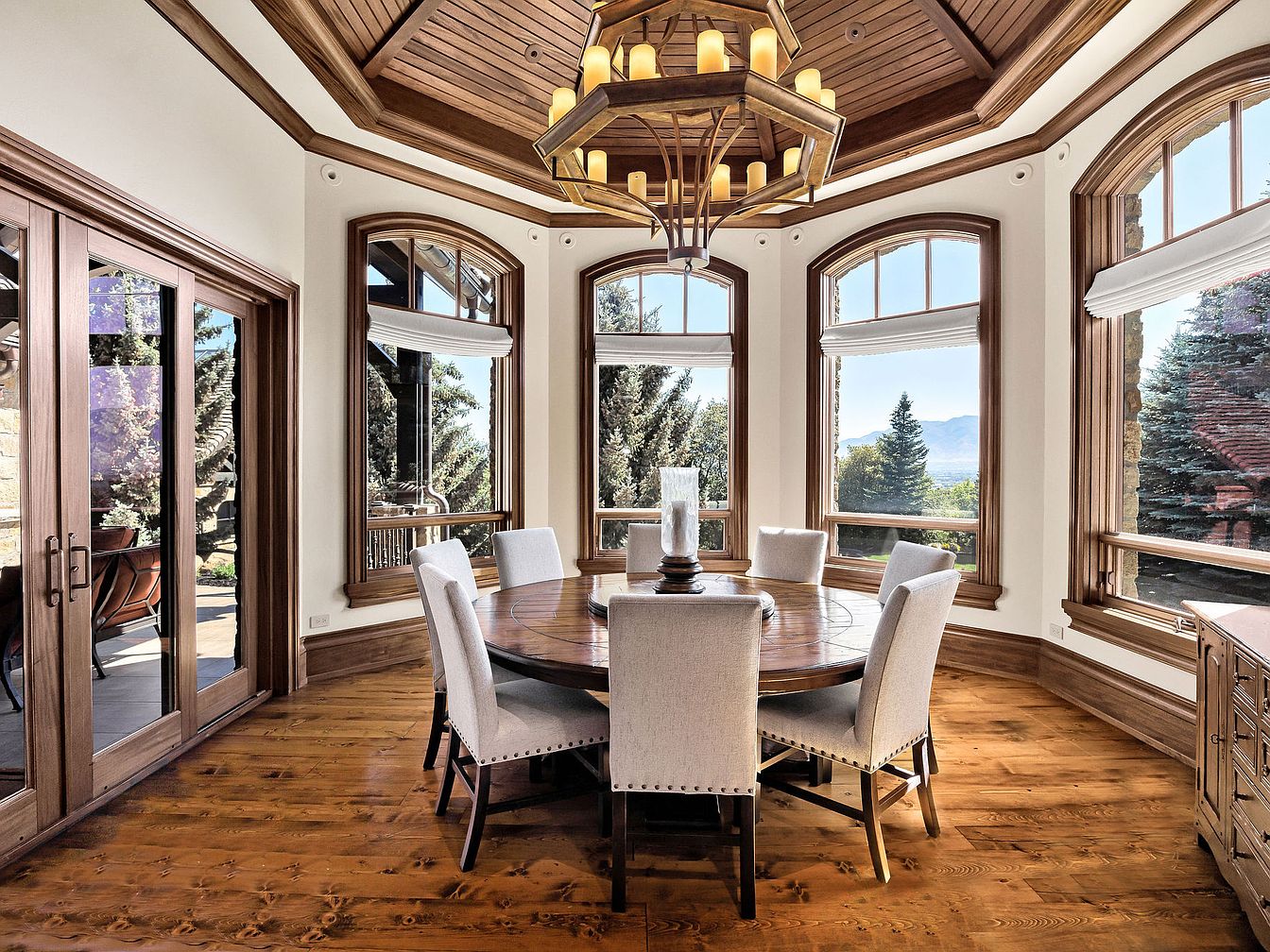 This charming dining room features an expansive round table that comfortably accommodates family gatherings. A breathtaking coffered ceiling enhances the sense of space, complemented by an elegant chandelier that provides warm ambient lighting. Rich wooden accents frame the large windows, inviting natural light while offering sweeping views of the outdoors. The warm, honey-hued hardwood flooring adds an inviting touch, while soft, upholstered chairs create a cozy yet sophisticated atmosphere. Ideal for entertaining, the layout allows for easy movement, making it a perfect place for meals and celebrations that foster connection and togetherness.