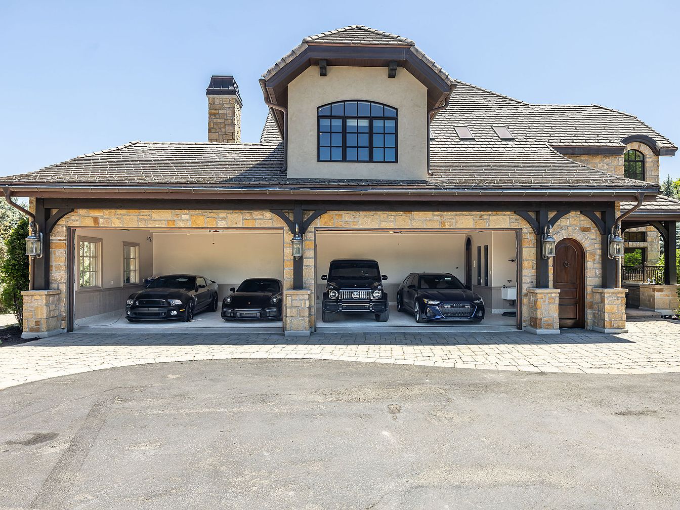 This expansive garage boasts a blend of functionality and sophistication, designed to accommodate multiple vehicles. Featuring high ceilings and elegant wooden beams, the structure highlights its architectural charm. The use of natural stone creates a warm yet modern aesthetic, perfectly complementing the sleek black cars parked within. Ample lighting illuminates the space, making it inviting and practical. Equipped with efficient storage solutions and a polished concrete floor, this garage is both a practical haven for car enthusiasts and a stylish entry point to the residence. The charming arched doorway adds a touch of refinement to the overall design.
