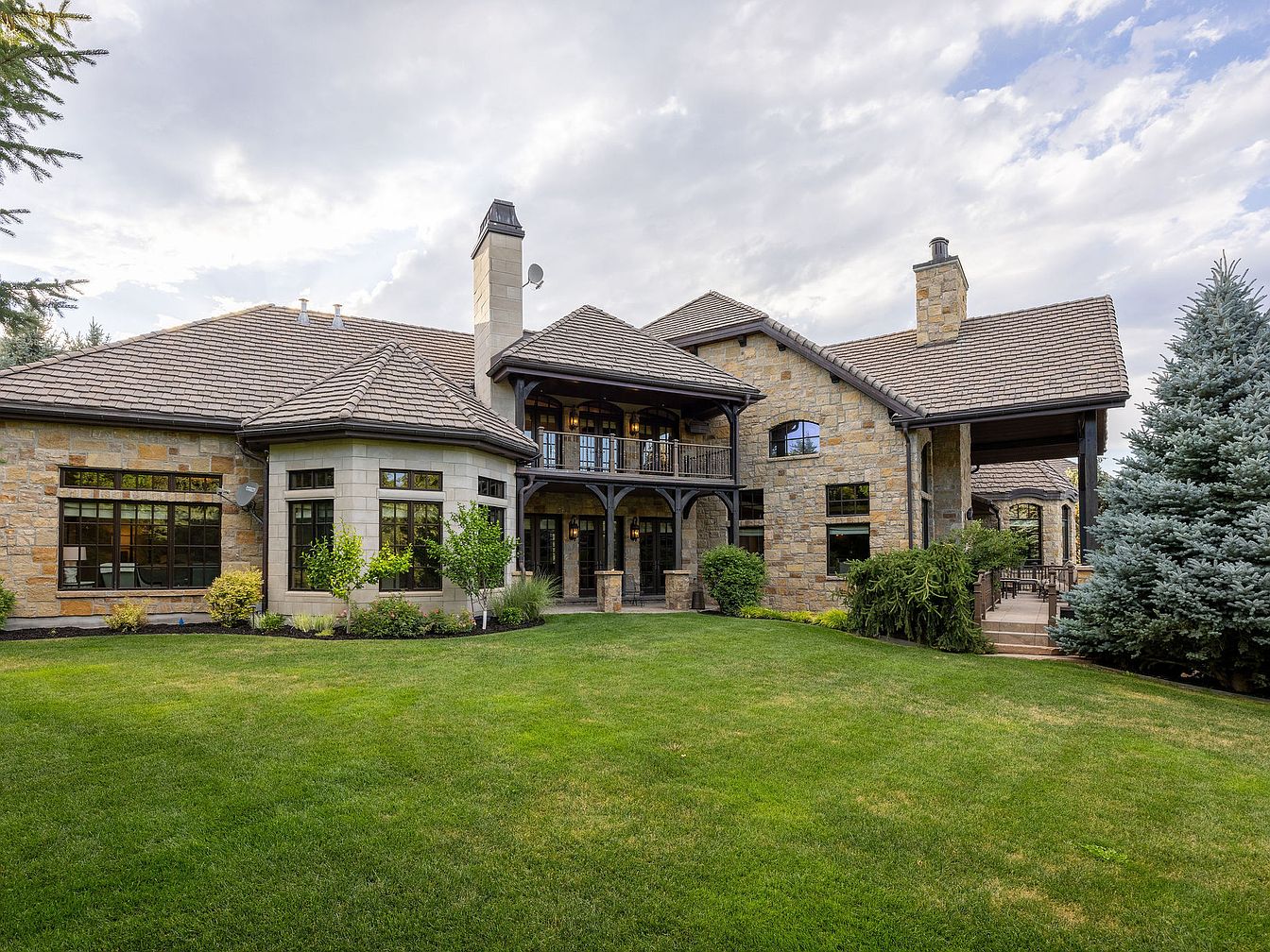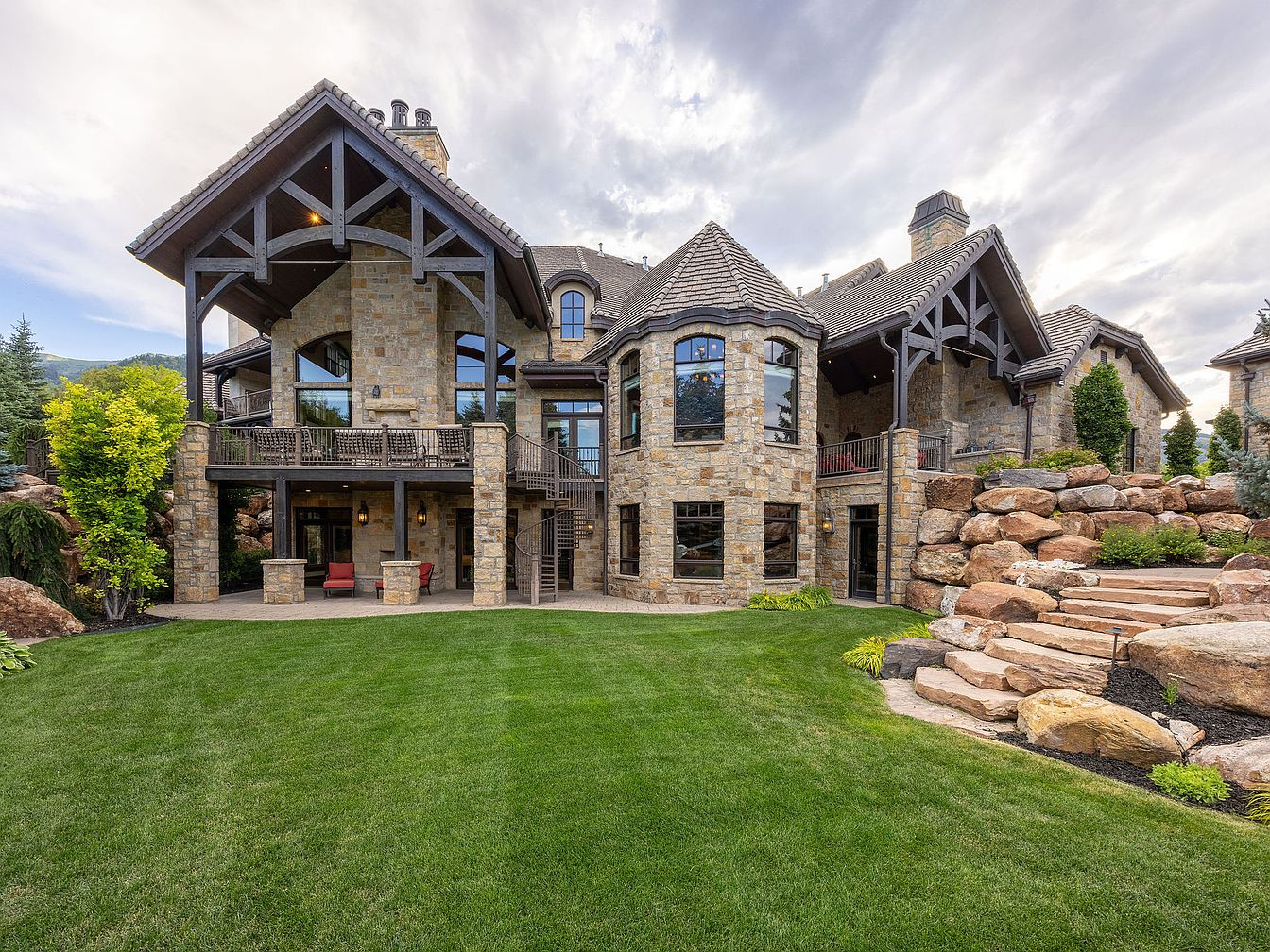 This stunning outdoor area features a magnificent stone-clad home, exuding a blend of rustic elegance and modern comfort. The spacious layout boasts large glass windows, inviting natural light and scenic views. A cozy balcony offers a perfect spot for relaxation, adorned with intricate wooden railings. The warm earth tones of the stone facade harmonize beautifully with the lush green lawn, ideal for family activities. Surrounding the home, carefully curated landscaping showcases boulders and vibrant plants, enhancing the serene ambiance. The balcony leads to a spiral staircase, seamlessly connecting outdoor living spaces for entertaining and enjoying the fresh air.