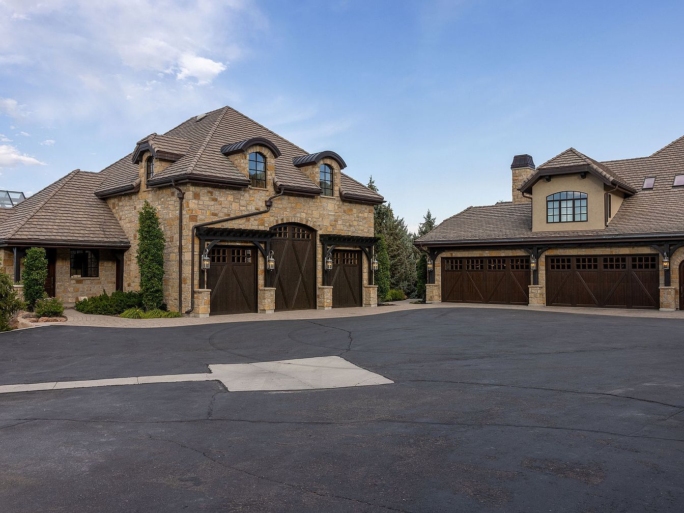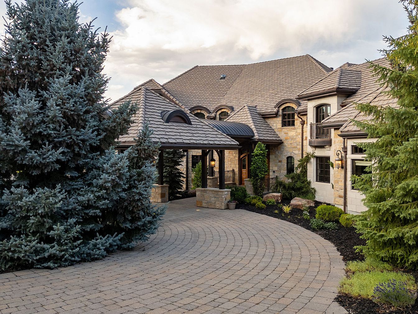 This stunning entranceway features intricate stonework and an inviting circular driveway crafted from stylish pavers. A majestic archway leads to a welcoming covered porch, adorned with elegant lanterns that enhance the warm ambiance. Lush landscaping, including towering blue spruce and manicured shrubbery, creates a picturesque setting that combines nature with architectural beauty. The rich color palette of muted earth tones on the facade harmonizes with the roof’s textured shingles, marrying traditional and modern design elements. Spacious, airy balconies provide additional outdoor living spaces, ensuring this entranceway not only makes a grand first impression but also offers family-friendly charm.