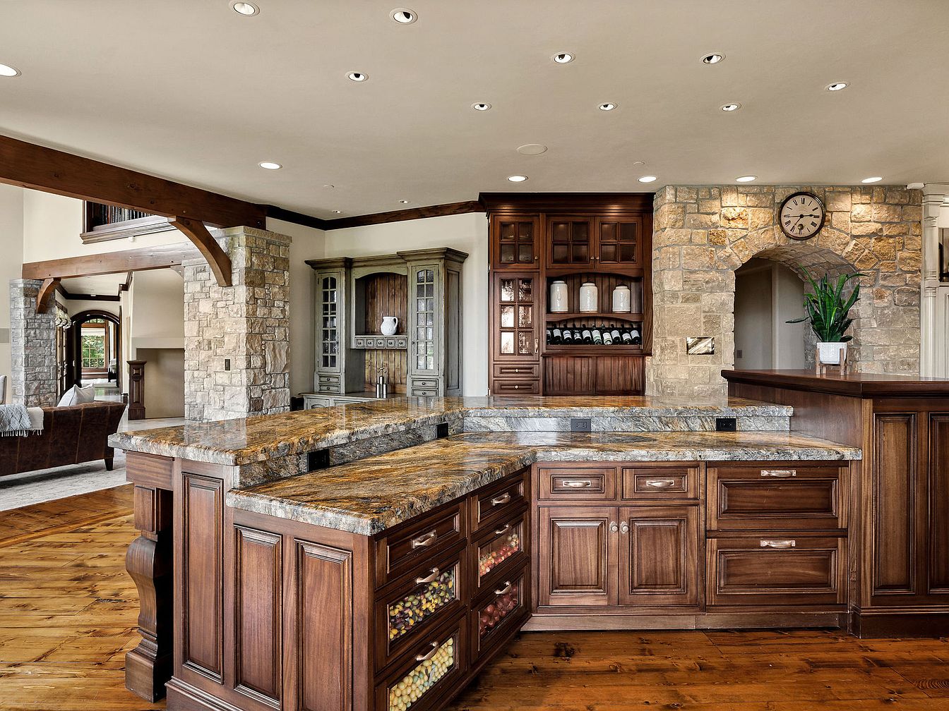 This gourmet kitchen welcomes with a spacious layout, blending rustic charm and modern elegance. Rich, dark wooden cabinetry complements the stunning granite countertops, featuring earthy tones that enhance the inviting atmosphere. The open space is adorned with exposed wooden beams, adding character while promoting a family-friendly environment for gatherings. Natural light streams in, illuminating the intricate details of the stone accents and the warm wood flooring. A tasteful arrangement of kitchenware and a built-in wine rack offer both functionality and style. Thoughtfully designed for culinary enthusiasts, it embodies comfort, efficiency, and elegance, making it perfect for both cooking and entertaining.