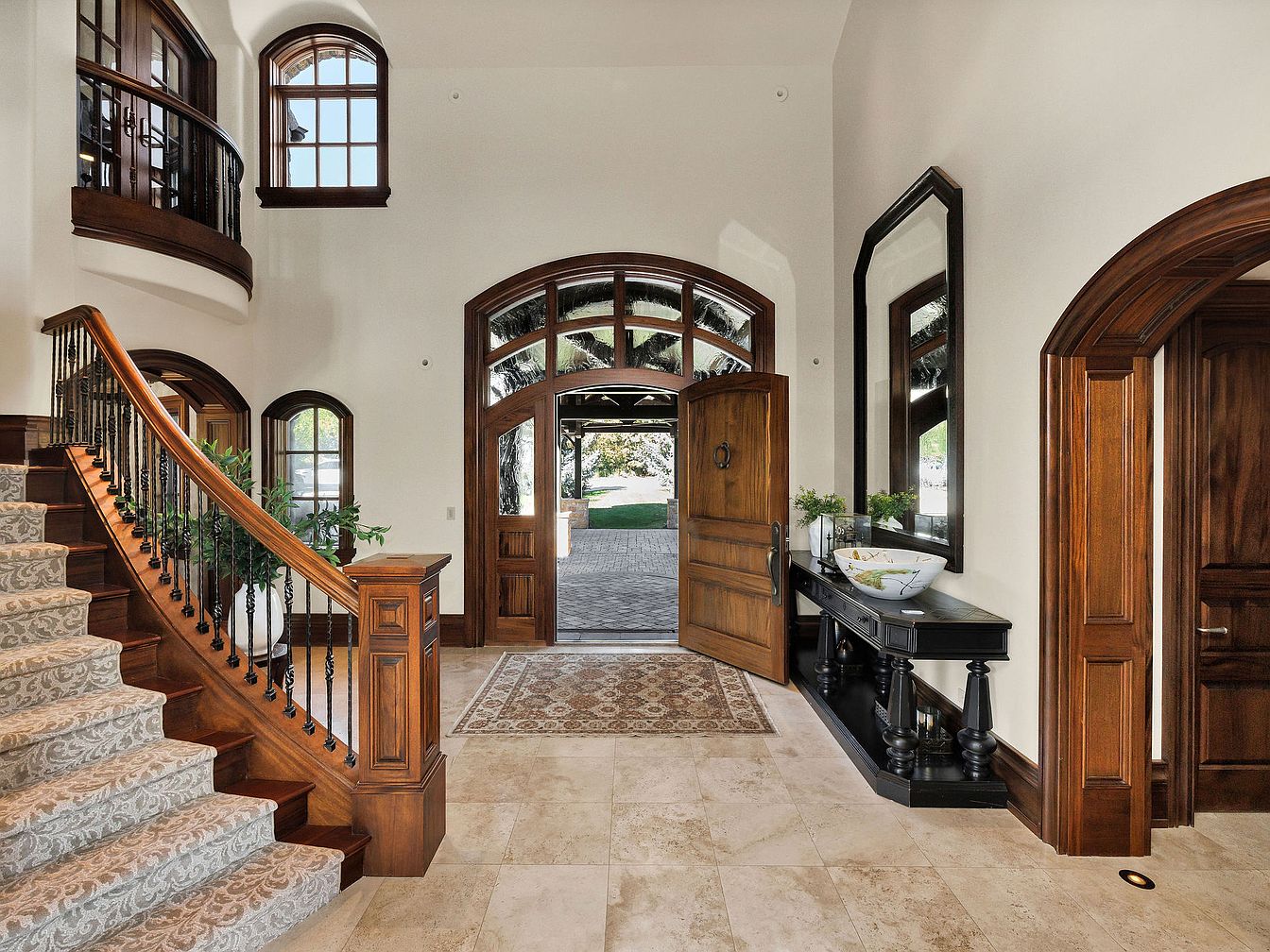 The grand entryway features elegant design elements that create an inviting atmosphere. A sweeping staircase with intricately patterned carpeting curves gracefully to the upper level, framed by rich wood railings. Arched doorways lead to adjacent spaces, while large windows flood the area with natural light, enhancing the warm color palette of cream and dark wood. A stylish console table, adorned with decorative accents and a striking bowl, adds sophistication and functionality. The open layout encourages family gatherings, and the polished stone floors provide durability and ease of maintenance, making this space perfect for a welcoming home.