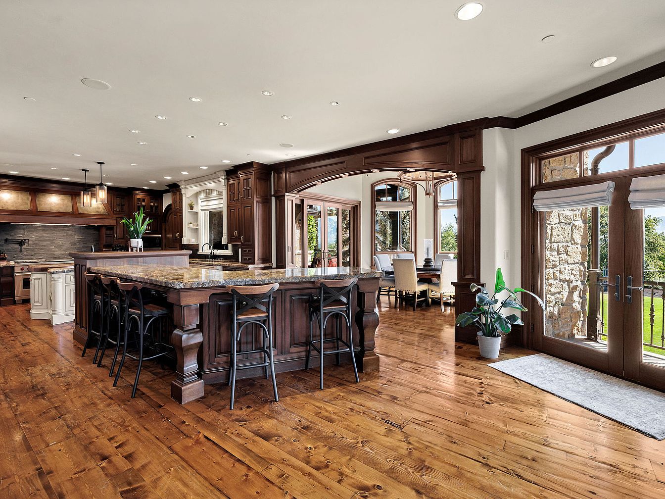 This spacious kitchen exemplifies a warm, inviting atmosphere, ideal for family gatherings. Featuring rich, dark cabinetry and stunning granite countertops, it seamlessly combines elegance with functionality. The expansive island doubles as a breakfast bar, fostering casual conversation, while surrounding areas boast natural light pouring in through large windows. The warm-toned hardwood floors enhance the cozy vibe, complementing the intricate woodwork around the entryways. With ample storage and a well-designed layout, this kitchen supports both culinary creativity and family bonding, making it a central hub for everyday activity and joyful moments.