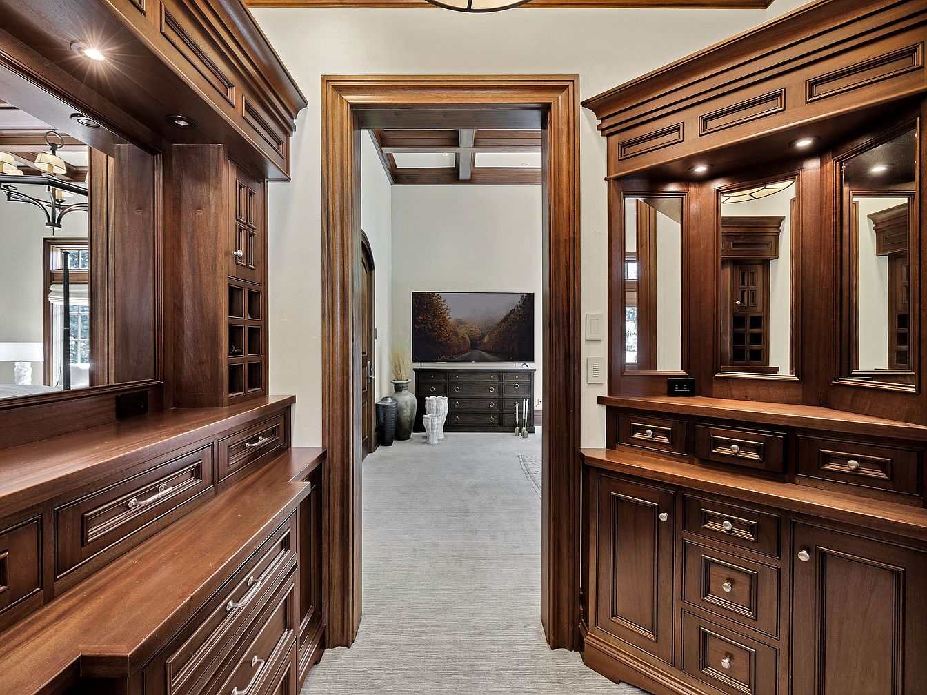 An inviting entryway features rich dark wood cabinetry, highlighting craftsmanship through intricate moldings and refined hardware. Spacious drawers and shelves offer ample storage for coats and accessories, keeping the area tidy. Soft, warm lighting accents the polished surfaces, creating an ambiance of elegance. A seamless transition to the adjacent living area can be seen through an arched doorway, which invites natural light from nearby windows. Neutral tones in the carpet and walls provide a serene backdrop, allowing the warmth of the wood to stand out. This thoughtfully designed space blends functionality with sophistication, ideal for welcoming family and guests.