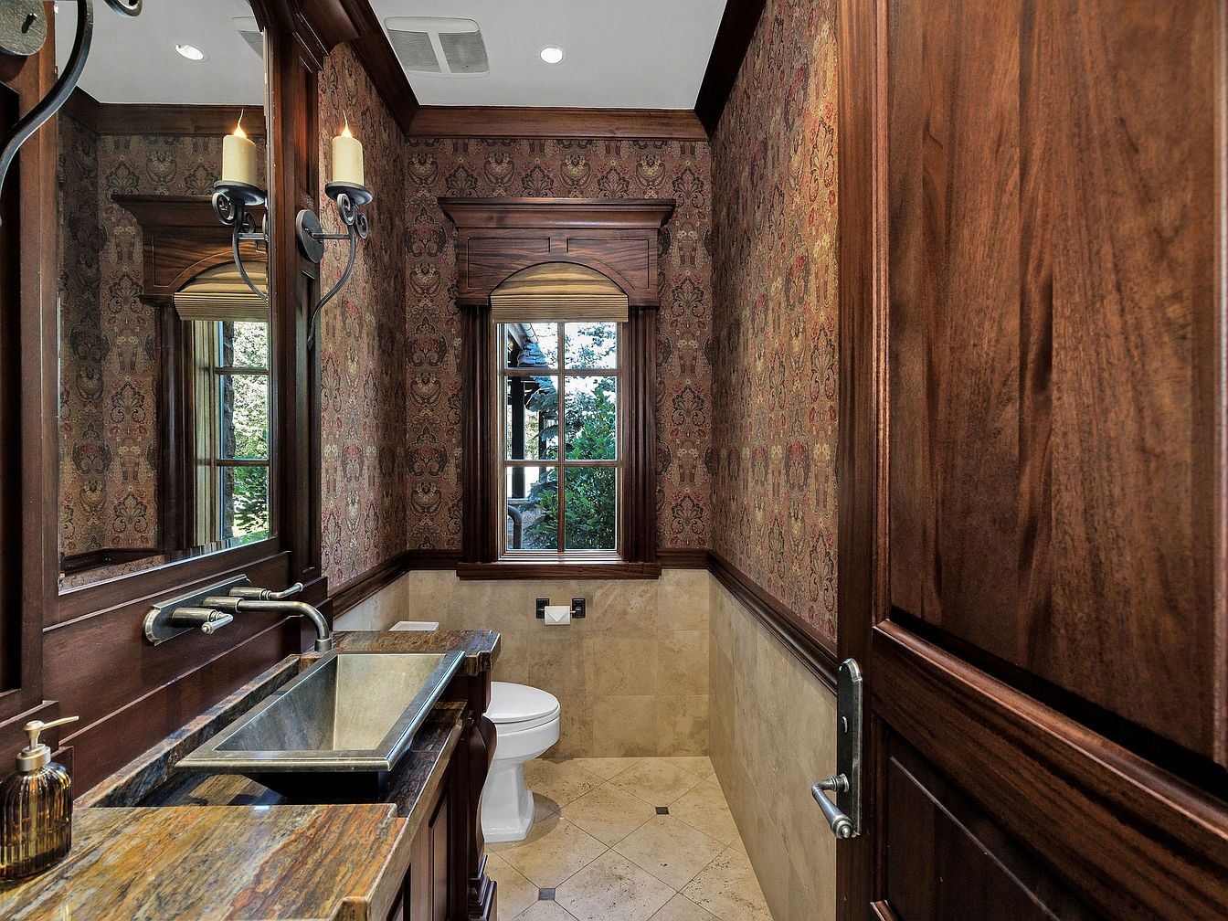 This sophisticated powder room boasts a rich, warm aesthetic featuring paneled mahogany walls and intricate floral wallpaper that adds texture and depth. The striking marble countertop contrasts beautifully with the sleek, modern vessel sink and vintage-style faucet, showcasing a blend of classic and contemporary design. A large window allows natural light to illuminate the space, framed by tasteful wooden trim, bringing a touch of the outdoors inside. Subtle lighting from wall sconces creates an inviting ambiance, while elegant tile flooring ties the elements together, making this intimate space both functional and stylish for family and guests.