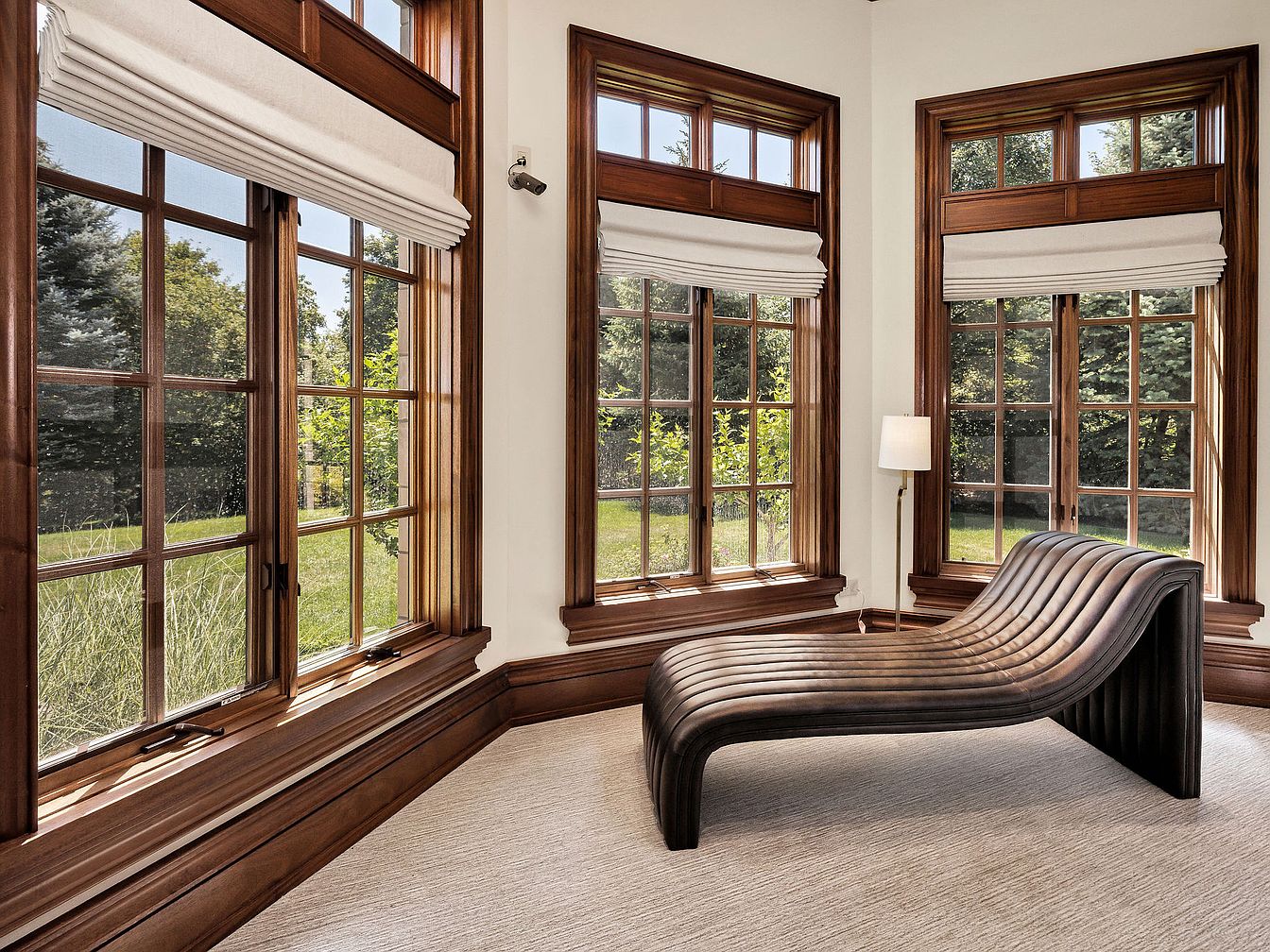 This sunroom offers a perfect blend of comfort and style, highlighted by its expansive, divided-light windows that invite abundant natural light while framing serene outdoor views. Rich wooden trim contrasts beautifully against the soft, neutral walls, creating a warm and inviting atmosphere. A sleek, modern chaise lounge provides an ideal spot for lounging or reading. The light-colored carpet enhances the room’s spacious feel, making it family-friendly and perfect for gatherings or quiet reflection. Elegant window treatments maintain privacy while allowing the sun to gently filter in, transforming this space into a tranquil retreat for relaxation.