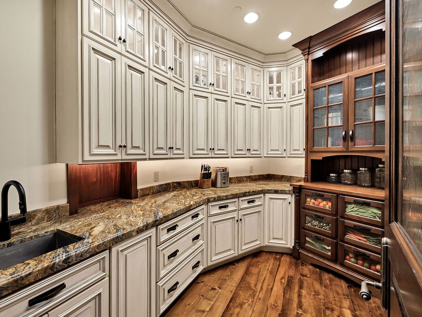 The kitchen pantry showcases an elegant design with ample storage, featuring tall, cream-colored cabinets accented with glass paneling that allows for a glimpse of organized items. A rich, wooden finish on the lower cabinets offers a warm contrast against the light cabinetry. The sprawling granite countertop presents a luxurious, speckled texture, enhancing functionality for meal preparations. Stylish black hardware completes the refined look, while the under-cabinet lighting creates an inviting ambiance. This family-friendly space, ideal for keeping essentials organized and accessible, perfectly blends sophistication and practicality, making it a cherished area for those who love to cook.