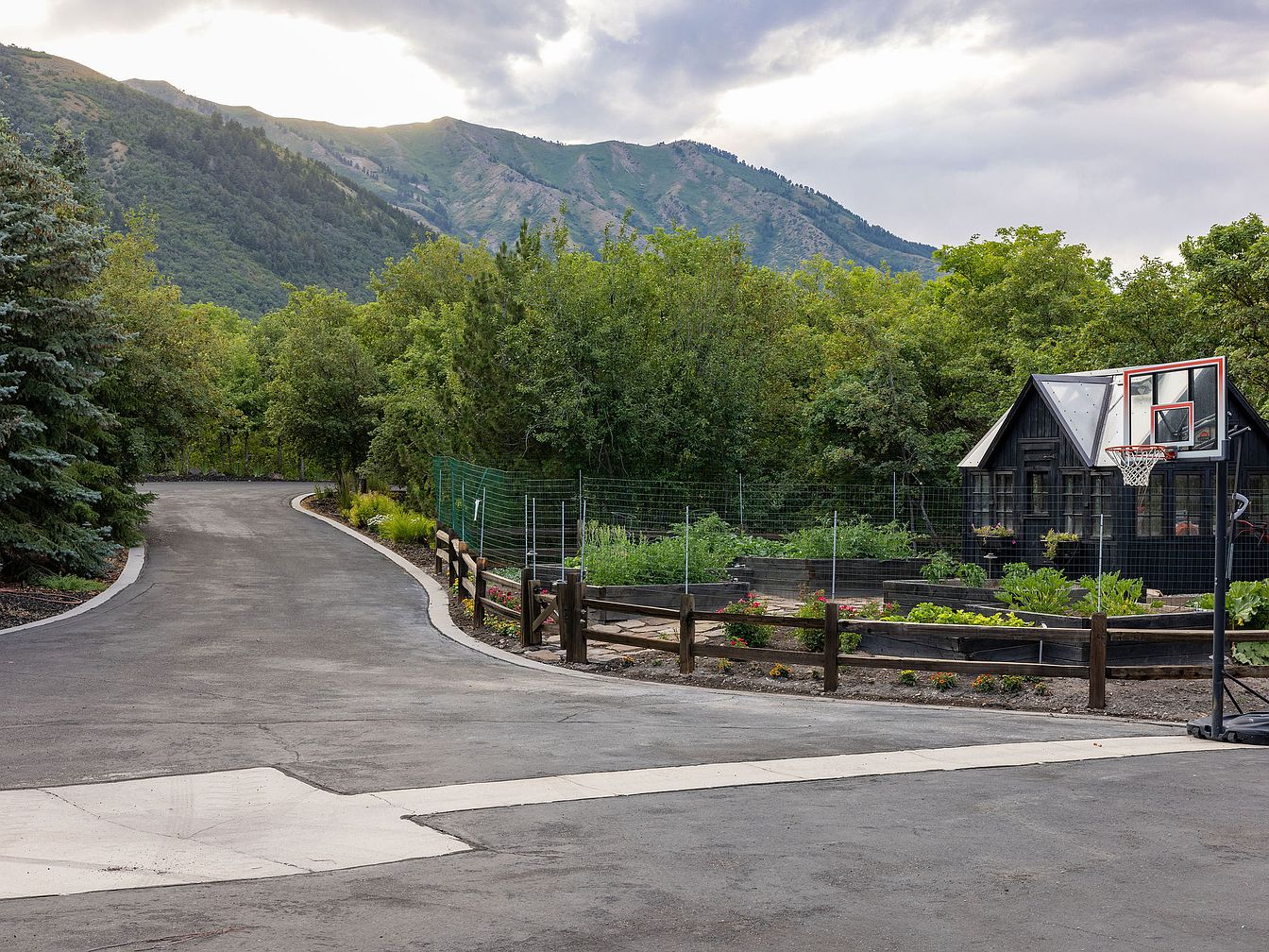 A winding, paved driveway leads to a charming black farmhouse, surrounded by lush greenery and majestic mountains in the background. The design showcases a mix of modern and rustic aesthetics, with a sleek geometric roof and large windows allowing natural light. Along the driveway, landscaped areas feature vibrant flower beds and a vegetable garden, emphasizing sustainability and family-friendly living. A basketball hoop adds an element of fun, inviting active family engagement. The color palette of the home contrasts beautifully with the natural verdure, creating a welcoming and tranquil atmosphere ideal for relaxation and recreation.