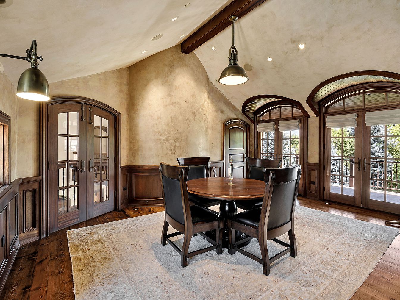This elegant dining room features a rounded wooden table surrounded by plush, high-backed chairs, creating an inviting space for family gatherings. The warm tones of the dark wood flooring complement the rich wooden accents found in the double doors and wall paneling. Large arched windows flood the room with natural light, enhancing the textured walls and softening the ambiance. A beautifully patterned rug anchors the space, adding an element of comfort. Unique light fixtures provide both illumination and a stylish focal point, making this room an ideal setting for intimate meals or festive celebrations.