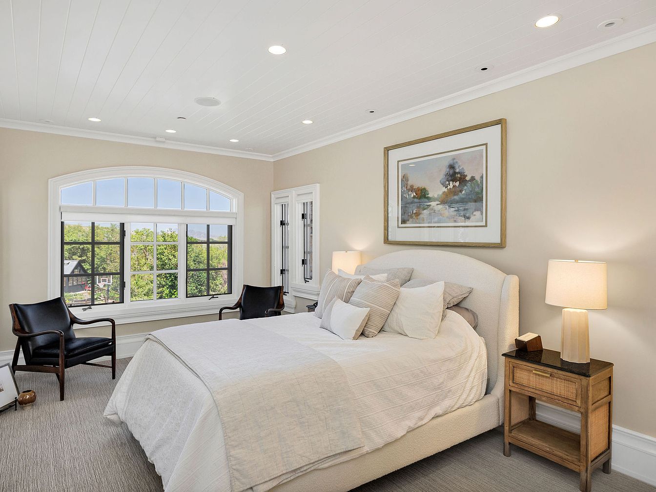 A serene master bedroom designed for comfort and relaxation. The layout features a spacious bed adorned with soft, textured linens and an array of decorative pillows, inviting restful nights. Natural light floods in through a large, elegantly arched window, complemented by sleek black frames that provide a picturesque view of the outdoors. Two stylish armchairs sit beside the window, perfect for quiet reading. Neutral walls paired with pale wood accents and warm lighting create a soothing environment. The minimalist wooden nightstand with a lamp adds a touch of elegance, enhancing the room’s modern aesthetic while maintaining a cozy feel.