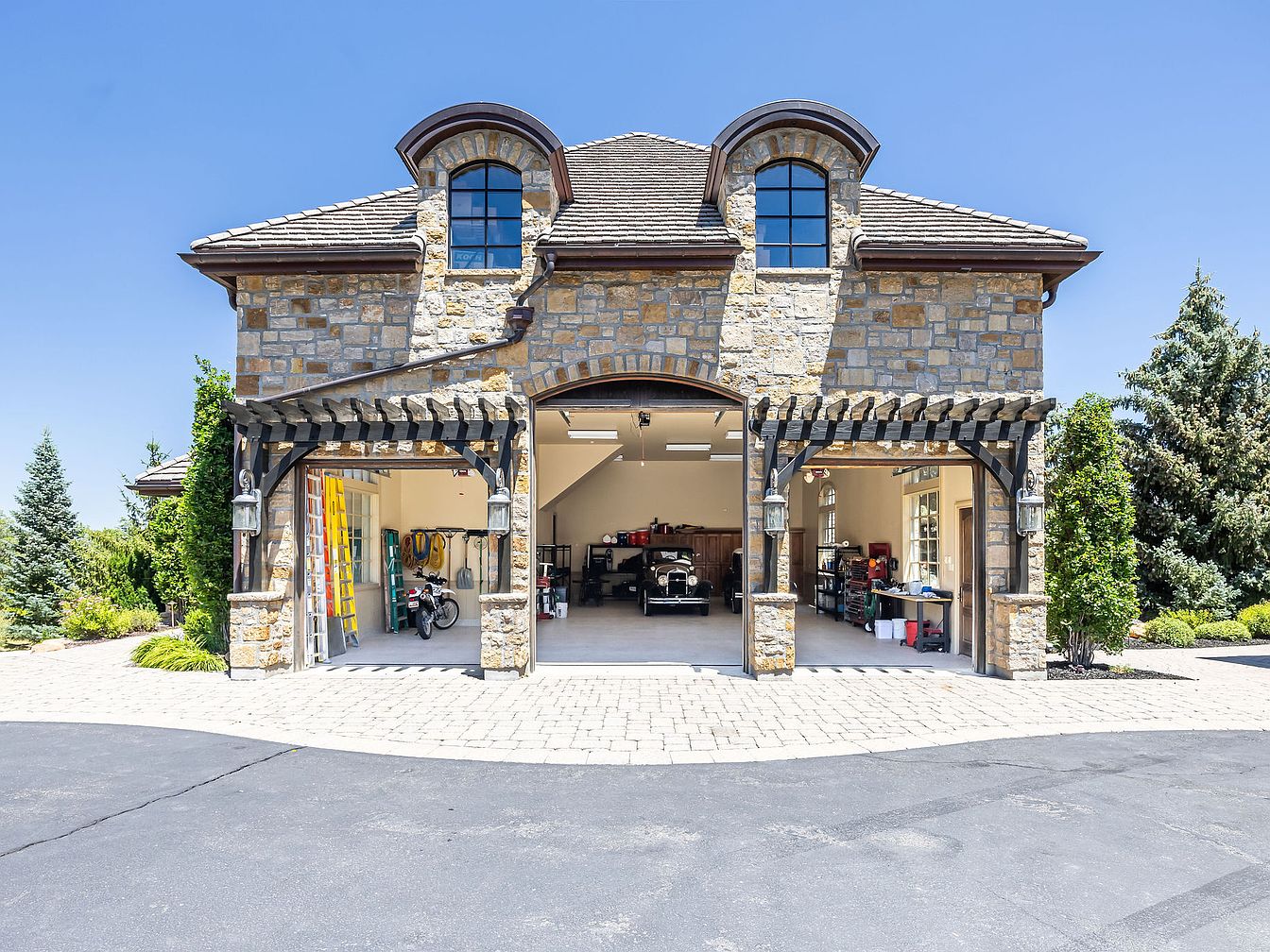 This exquisite garage combines functionality with stunning aesthetics, featuring a blend of natural stone and rich wood accents. The architectural design showcases arched entries framed by intricately crafted pergolas, offering an inviting touch. Inside, the spacious layout accommodates multiple vehicles and equipment, promoting an organized, family-friendly environment. Natural light floods in through large windows, enhancing the warm, earthy color palette of the stone and wood finishes. The garage also boasts built-in storage solutions, ensuring a tidy space for tools and recreational items. Lush landscaping surrounds the area, contributing to an overall sense of tranquility and elegance.
