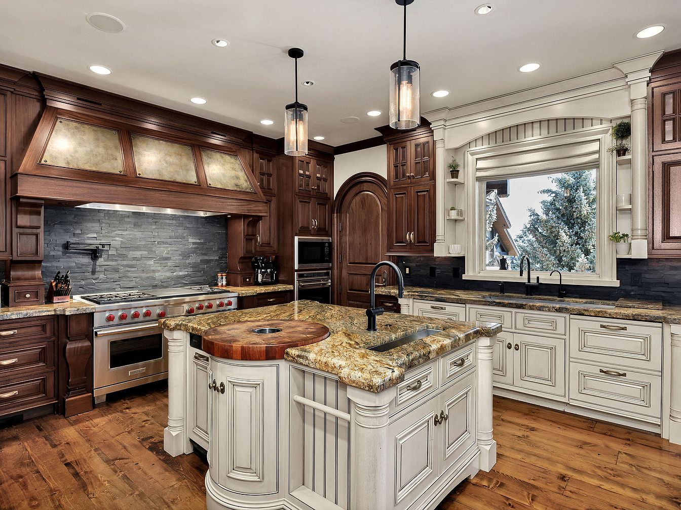 A stunning chef’s kitchen showcases a harmonious blend of rich, dark wood cabinetry and elegant white details, creating a warm and inviting atmosphere. The expansive island, featuring a striking double-tone countertop, serves as both a prep zone and a gathering spot for family and friends. Sleek gray stone backsplashes contrast beautifully with the polished finishes, and high-end stainless steel appliances promise culinary excellence. Thoughtfully placed lighting enhances the ambiance, while large windows flood the space with natural light and offer picturesque views. This thoughtfully designed kitchen blends functionality with luxury, perfect for family-friendly gatherings.