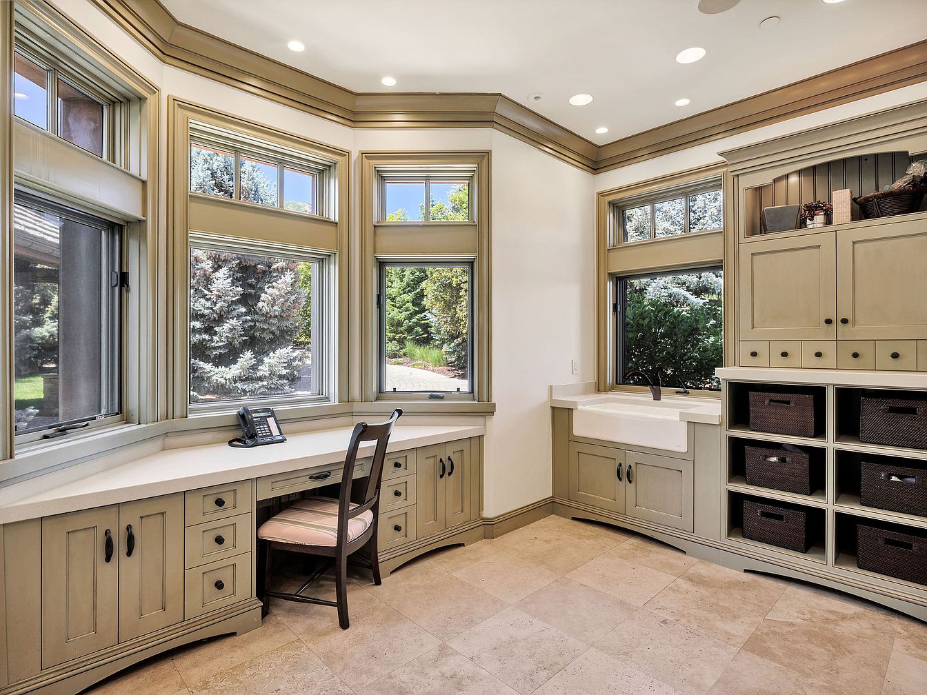 A sophisticated home office featuring a built-in corner desk with sleek cabinetry in a soft taupe hue provides a tranquil workspace. Large windows allow natural light to flood in, enhancing the inviting atmosphere while offering views of the lush surroundings. The design includes decorative crown molding that adds elegance to the architectural details. A comfortable chair complements the practical desk space, perfect for long hours of productivity. Functional storage cabinets with woven baskets keep the area organized and clutter-free. The warm color palette combined with the stone-tiled floor creates a harmonious blend, making this office a serene retreat.