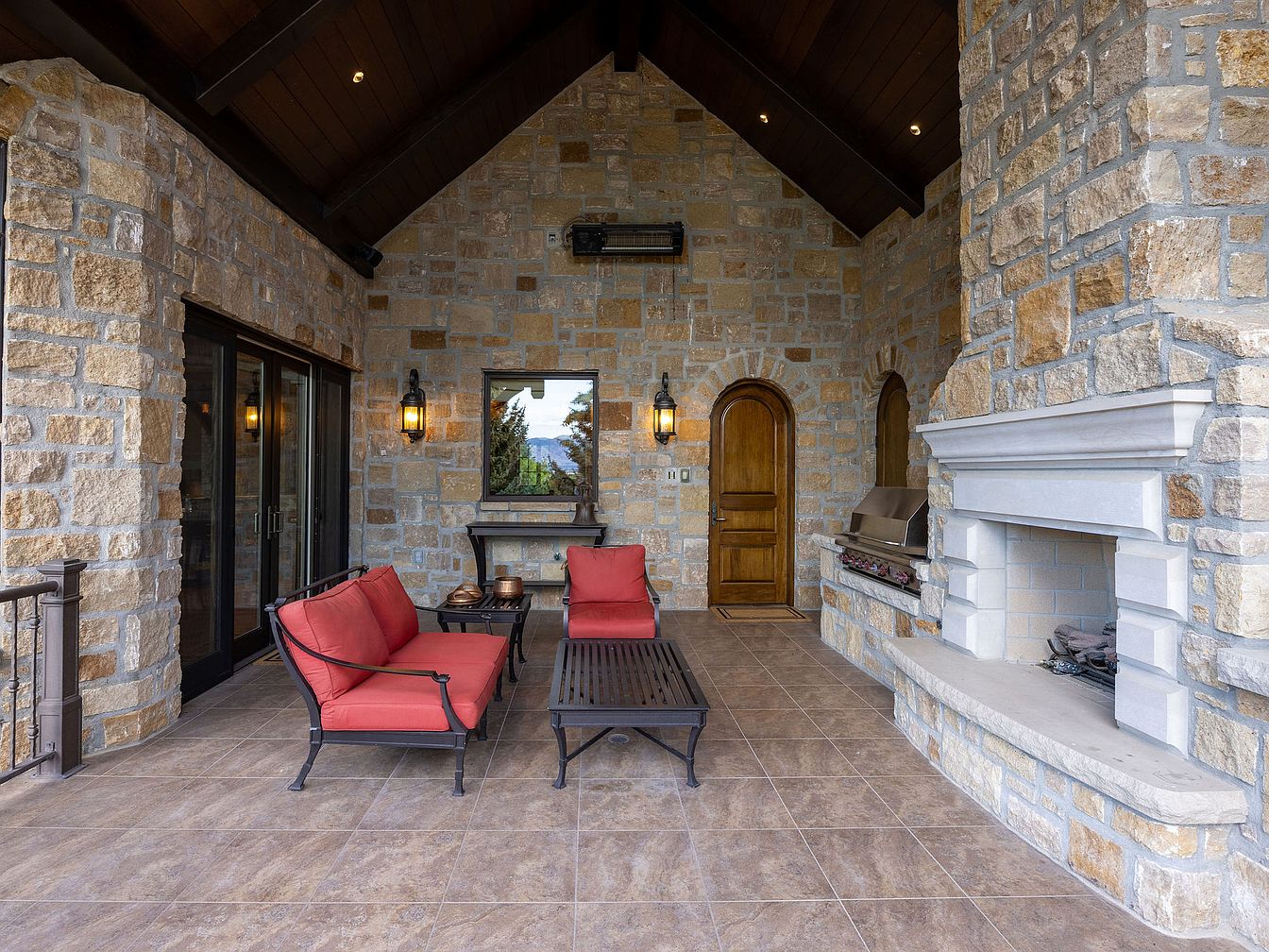 This inviting outdoor living area embraces a rustic charm with its stunning stone walls and a dramatic vaulted ceiling. The space features plush seating in rich red, perfectly paired with a textured black coffee table, making it ideal for family gatherings or cozy evenings. Warm wood accents and vintage-style light fixtures enhance the ambiance, while large glass doors offer seamless indoor-outdoor flow and magnificent views of surrounding nature. A built-in grill and elegant fireplace serve as focal points, ensuring comfort and functionality for entertaining. Earthy tones unify the design, creating a harmonious and welcoming atmosphere.