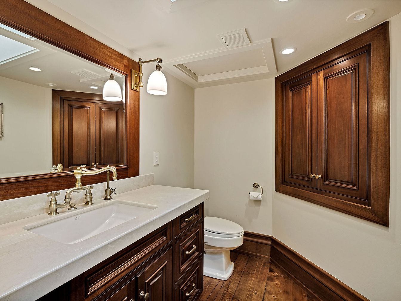 This elegant bathroom showcases a harmonious blend of modern and traditional elements. A spacious vanity with rich mahogany cabinetry features intricate detailing, accented by polished brass fixtures that add a touch of luxury. The white countertop complements the warm tones of the wooden cabinets, promoting an inviting atmosphere. Soft, recessed lighting and two pendant lights illuminate the space, enhancing its spacious feel. A mirror framed in polished wood reflects the room’s refined aesthetics. Practical features like ample storage and strategic wall spacing make this a family-friendly bathroom, perfect for daily routines while maintaining an air of sophistication.