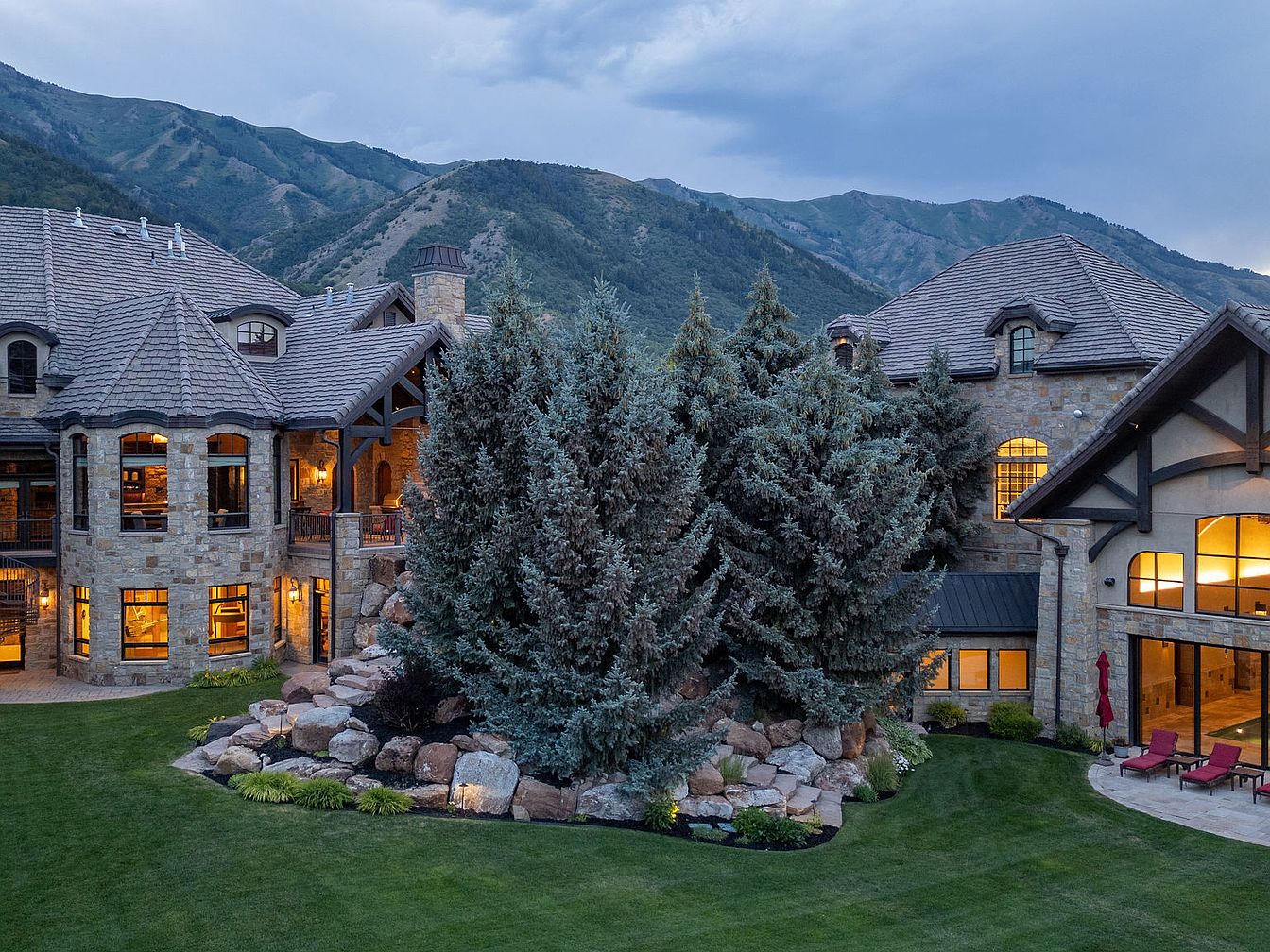 This stunning outdoor space showcases a blend of natural beauty and architectural elegance. The carefully curated garden features lush green lawns complemented by a striking rock formation, enhancing the home’s charm. Towering evergreen trees provide privacy while harmonizing with the majestic mountain backdrop. Stonework on the home’s exterior reflects rustic elegance, merging seamlessly with large glass windows that invite warm light inside. The strategic placement of comfortable seating areas encourages family gatherings and outdoor relaxation, creating an inviting atmosphere. Subtle landscape lighting highlights the home’s architectural features and the natural elements, making this a breath-taking retreat.