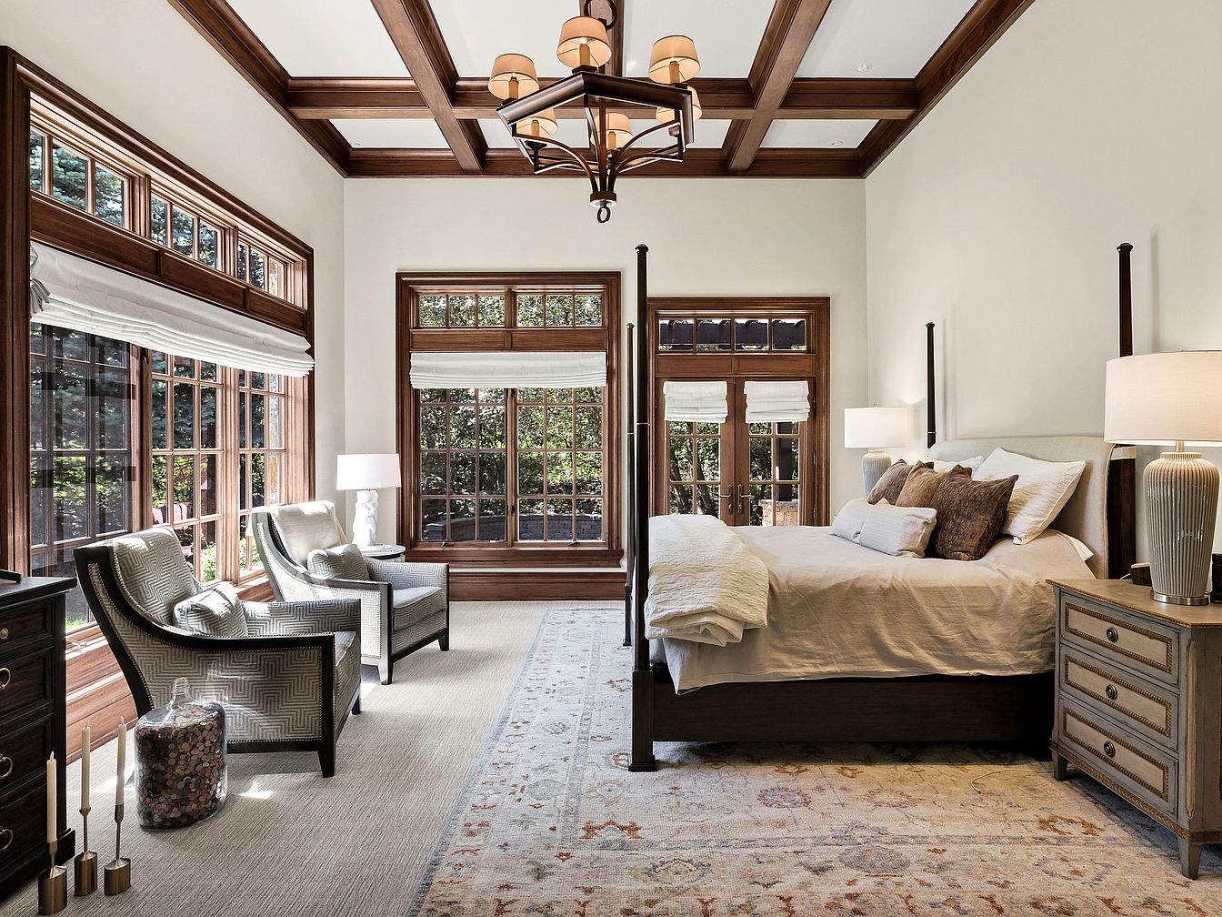 This master bedroom exudes a tranquil and inviting atmosphere, perfect for relaxation. The spacious layout features a sophisticated four-poster bed flanked by elegant nightstands, adorned with tasteful lamps. Large windows allow natural light to flood in, framed by soft, neutral shades that enhance the airy feel. The coffered ceiling adds architectural interest, while rich wooden accents complement the warm color palette. Cozy armchairs nestled by the window create a perfect reading nook. A plush area rug adds comfort underfoot, and decorative pillows on the bed provide a touch of softness, making this space both family-friendly and elegant.