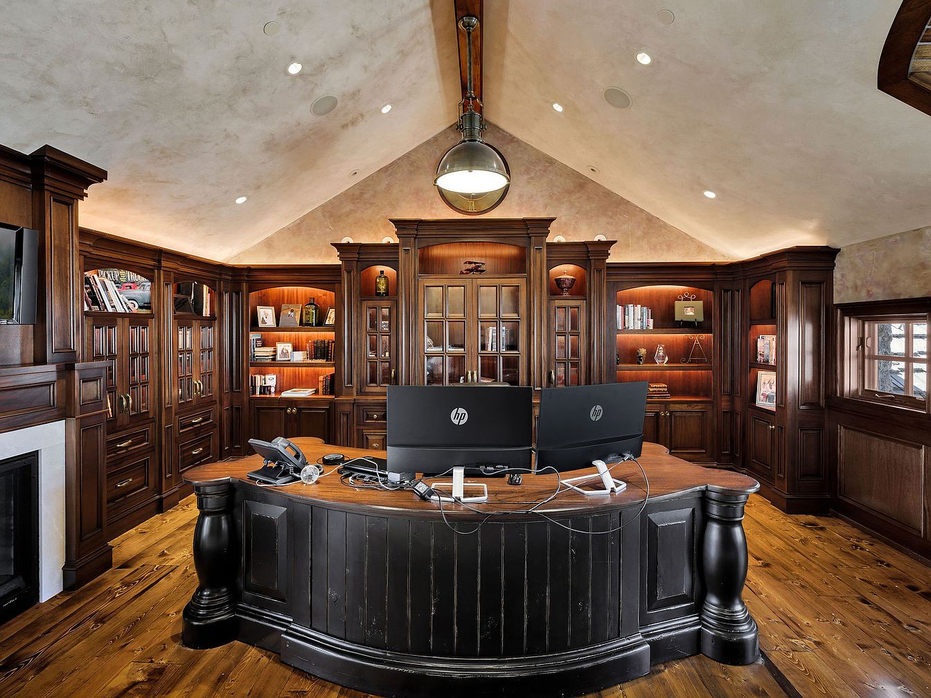 This home office embraces a warm, inviting atmosphere with rich wooden cabinetry and a vaulted ceiling. The custom-built shelves, adorned with books and decorative items, create a sophisticated yet cozy backdrop. A large, curved desk commands attention at the center, offering ample workspace with modern dual monitors. Underfoot, wide-plank hardwood floors enhance the rustic charm, while softly lit sconces illuminate the room, fostering a productive environment. The combination of deep wood tones and crisp architectural lines evokes timeless elegance, making this space ideal for both focused work and casual meeting engagements.