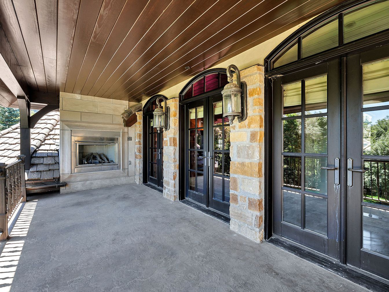 This elegant covered patio features a harmonious blend of stone and wood, providing both warmth and sophistication. The rich, wooden ceiling contrasts beautifully with the sleek, gray stone fireplace, creating a cozy focal point. Large black-framed doors allow for ample natural light while offering seamless connection to the surrounding greenery. The sturdy stone walls add character and durability, making this space ideal for both entertaining and relaxing. Stylish lanterns hang down to enhance the ambiance, ensuring evenings are perfectly illuminated. With its spacious layout and family-friendly design, this patio is an inviting haven for quality time outdoors.
