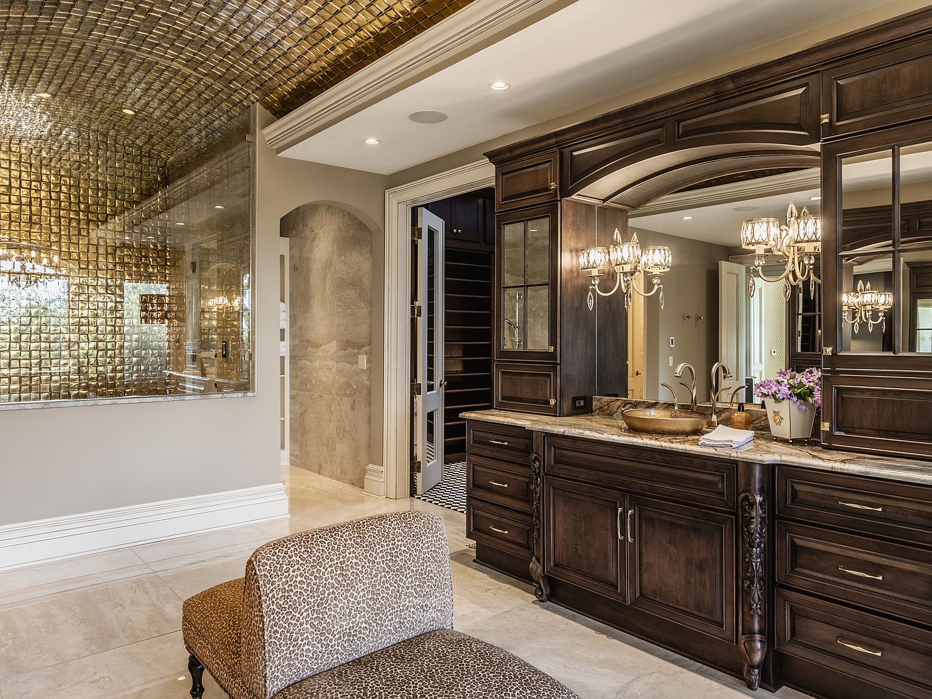 A spacious and elegant bathroom features a grand vanity area with dark-stained wooden cabinetry and richly detailed molding. A marble countertop with gold vessel sinks adds a touch of opulence, complemented by ornate crystal chandeliers that create a warm, inviting ambiance. The mirrored wall enhances the sense of space and brightness, while the adjacent shower is enclosed with striking gold-tiled glass, giving the room a glamorous touch. Soft neutral tiles on the floor and a comfortable animal-print bench provide family-friendly functionality, ensuring both style and comfort for everyday routines in a space perfect for relaxation and self-care.