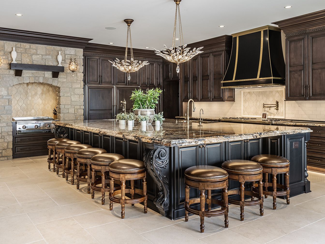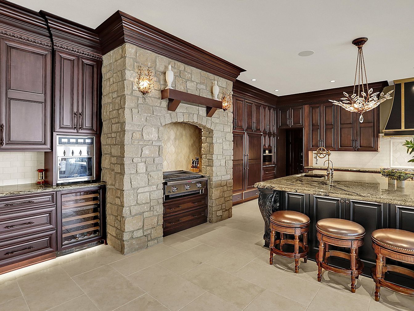 This spacious kitchen blends traditional elegance with modern comfort, featuring rich dark wood cabinetry that provides ample storage for a busy household. A prominent stone surround encloses a gourmet stove, evoking the warmth of a classic hearth, while intricate crown moldings add architectural grandeur. The large granite island, accented by ornate corbels and three plush, round bar stools, creates a welcoming space for family gatherings and casual meals. Soft beige tiles keep the space bright and easy to clean, and a sophisticated chandelier adds a touch of glamour, making this kitchen both family-friendly and luxurious.