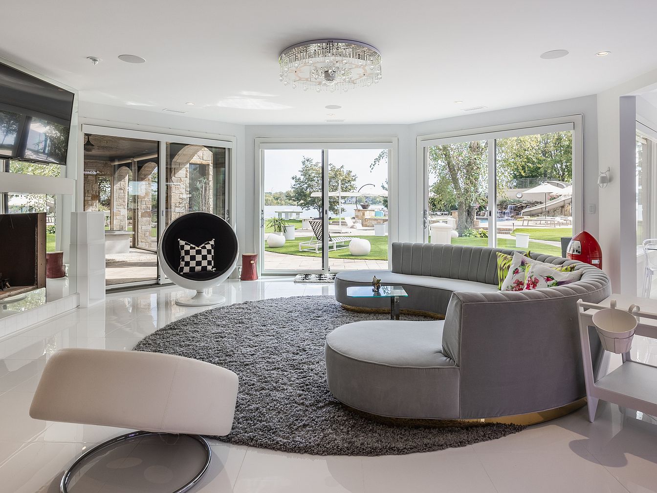 A bright, open-plan living area blends contemporary style with cozy comfort, making it perfect for families. A curved, plush grey sofa anchors the room, surrounding a glass coffee table atop a round shag rug, inviting group gatherings or relaxing moments. The space features modern accent chairs, playful pillows, and a shimmering chandelier that adds a touch of glamor. Floor-to-ceiling sliding glass doors fill the room with natural light and provide seamless access to the outdoor patio and lush green yard, fostering indoor-outdoor living. Soft whites and greys dominate, while colorful accents add warmth and energy to the inviting atmosphere.