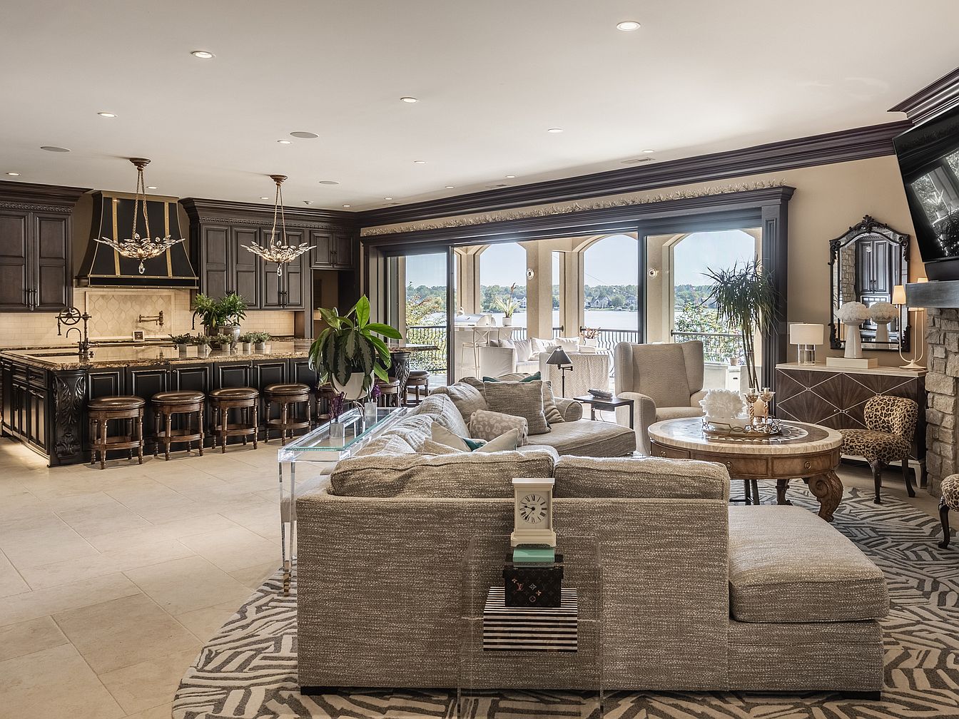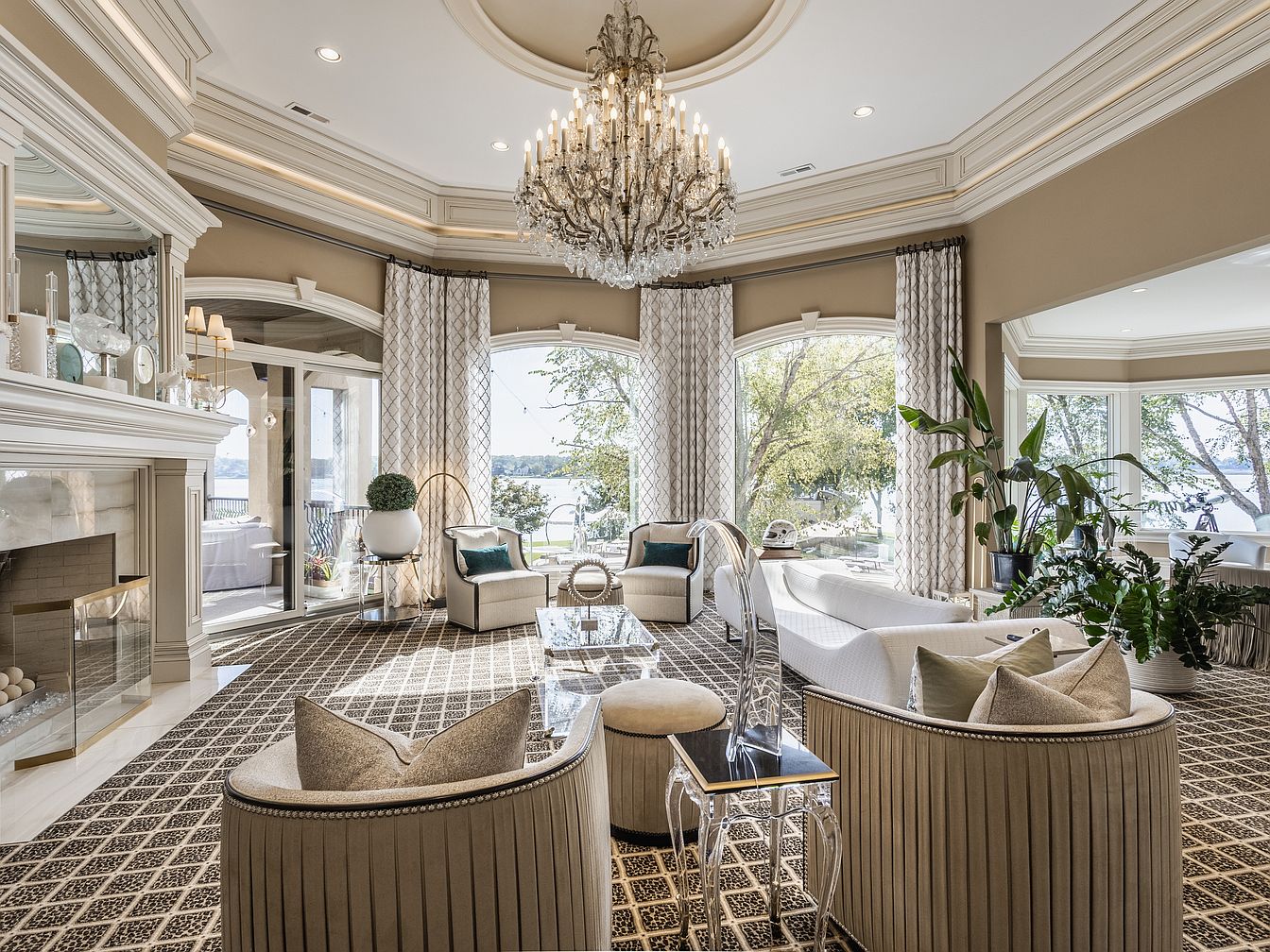 An elegant, light-filled living room showcases a sophisticated blend of traditional and modern décor. The space features a stunning crystal chandelier, coffered ceiling, and expansive windows offering serene lake views, flooding the room with natural light. Plush, neutral-colored seating is arranged for conversation and comfort, enhanced by accent pillows and a bold geometric-patterned carpet. Ornate trim and detailed fireplace molding reflect timeless architectural style. Large houseplants add a touch of greenery, while kid-friendly furnishings such as rounded chairs and soft textures create a welcoming environment suitable for the entire family. The gentle palette ensures a warm, inclusive atmosphere for gatherings.