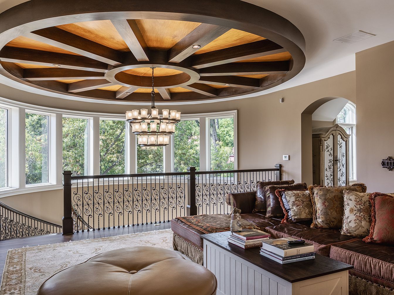This inviting loft lounge area is brightened by a row of panoramic windows that overlook lush greenery, flooding the space with natural light. The highlight is the dramatic circular coffered ceiling with rich wood beams and a striking chandelier centerpiece. The comfortable sectional sofa, adorned with plush, patterned cushions, creates a cozy family gathering spot. Soft earth tones and warm neutrals give the area a welcoming ambiance, complemented by a light area rug and a large leather ottoman. Elegant wrought-iron railings define the space, providing an open view to the staircase, making it ideal for relaxation or entertaining guests.