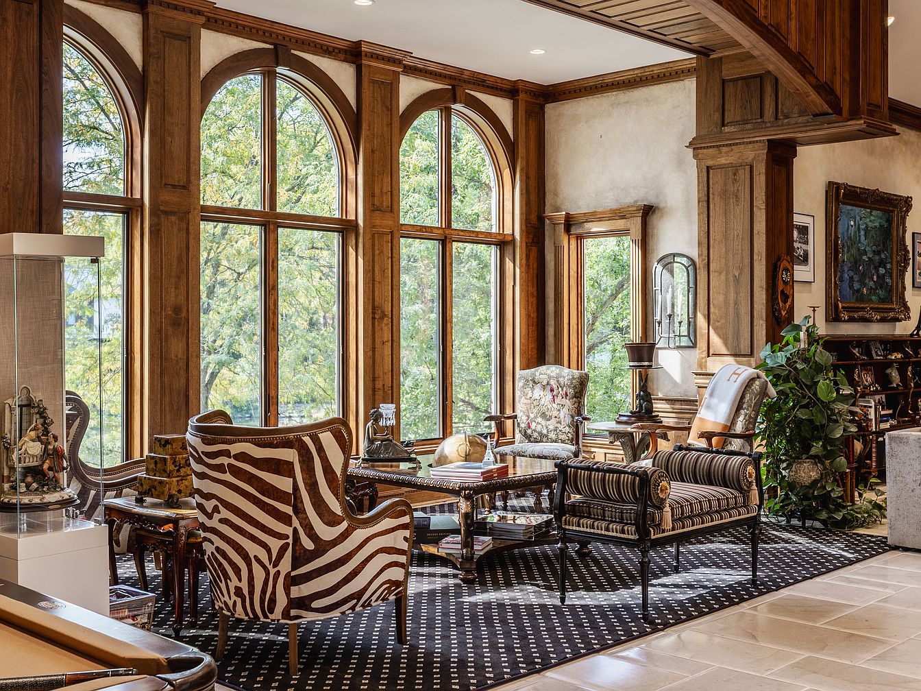 This cozy living room lounge features soaring wood-trimmed arched windows that bathe the space in natural light and offer breathtaking views of surrounding greenery, making it perfect for families who enjoy relaxing together. A mix of patterned armchairs, including zebra print and floral designs, creates an inviting, eclectic atmosphere, while a dark, dotted area rug anchors the seating arrangement. The neutral walls are enhanced by rich wooden moldings and ceiling beams, adding warmth and traditional charm. Family-friendly touches include comfortable seating, ample table space for games or crafts, and well-curated decor that balances sophistication with a welcoming feel.