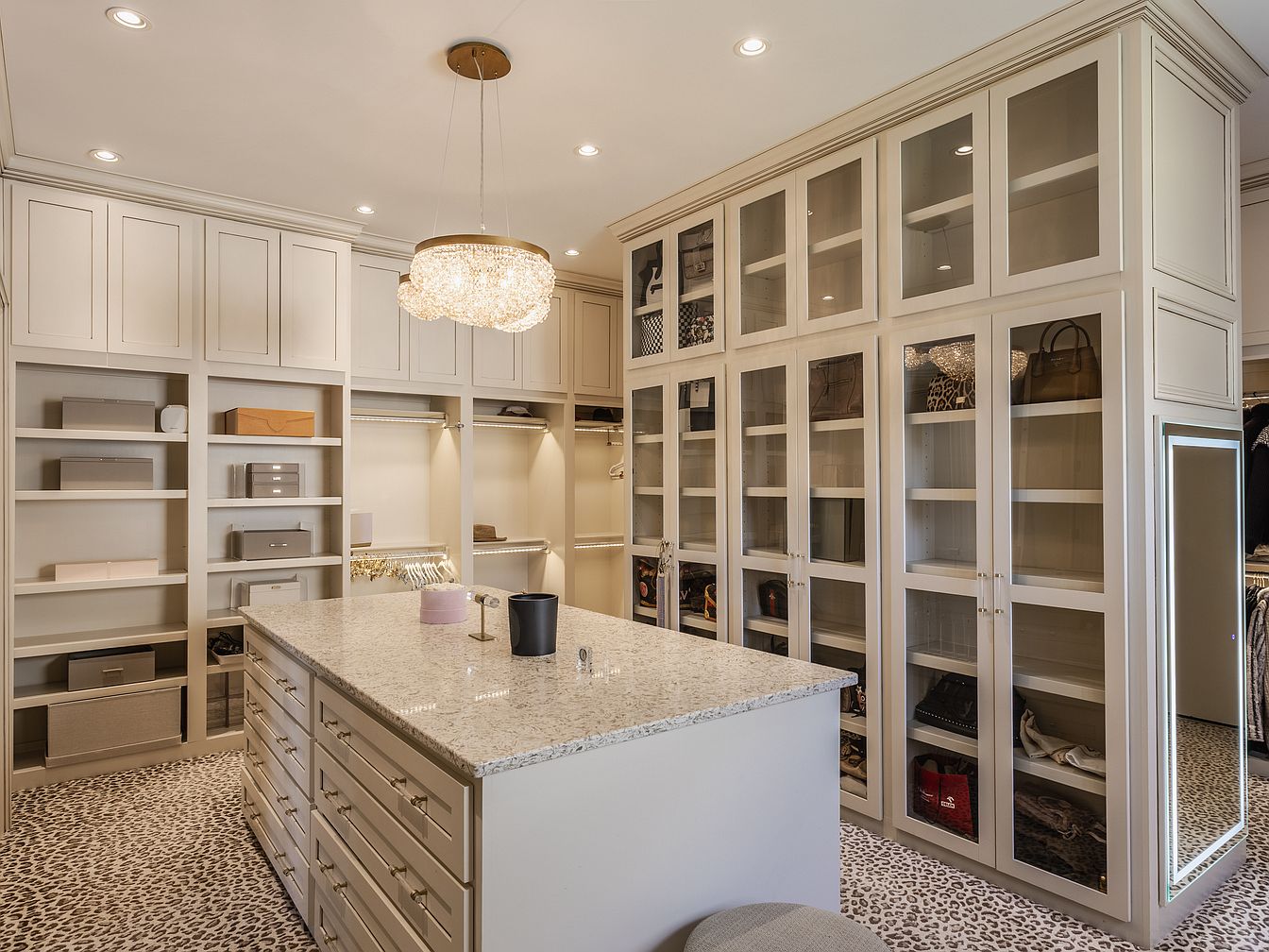 A spacious walk-in closet features custom cabinetry with a mix of glass-front doors and open shelving, ideal for organizing clothing, handbags, and accessories. Neutral shades of cream and taupe create a calming, sophisticated ambiance, highlighted by a stunning crystal chandelier that adds elegance and warmth. The granite-topped island in the center provides additional storage and serves as a convenient folding or staging area. Softly patterned carpeting adds a touch of fun while remaining family-friendly and durable. Ample lighting and a full-length mirror ensure both functionality and a luxurious dressing experience for all members of the household.