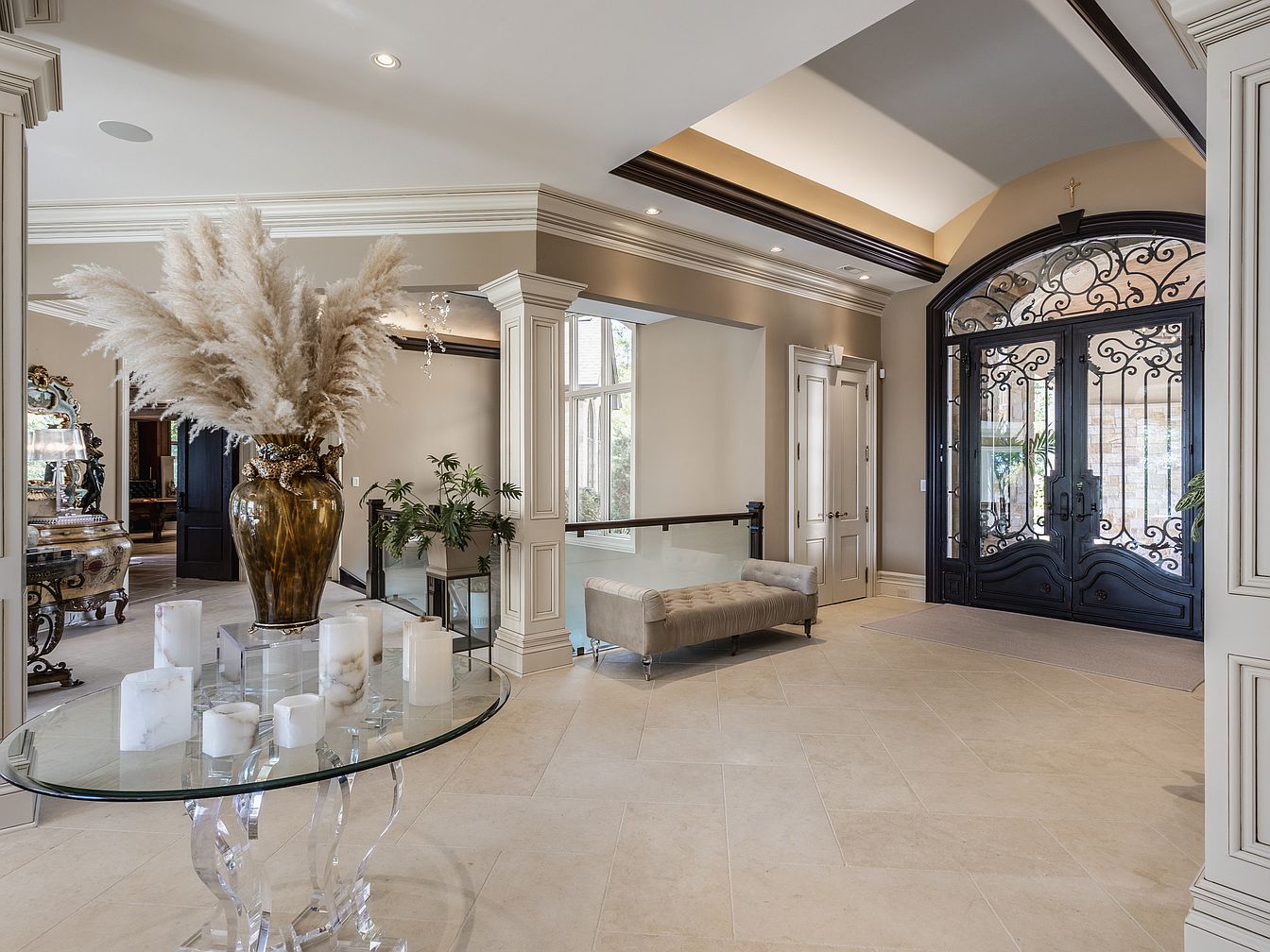 A spacious entryway welcomes guests with soaring ceilings, creamy walls, and elegant crown molding to set an upscale yet inviting tone. Double wrought-iron doors framed by arches fill the space with natural light. A plush bench offers a convenient spot for removing shoes or organizing bags, perfect for family life. The round glass table, anchored by a sculptural chrome base, holds a dramatic vase of pampas grass and a collection of candles, adding warmth and a soft organic touch. Neutral stone tile flooring enhances the airy feel, while subtle details like mirrored furniture and lush greenery provide sophisticated finishing touches.