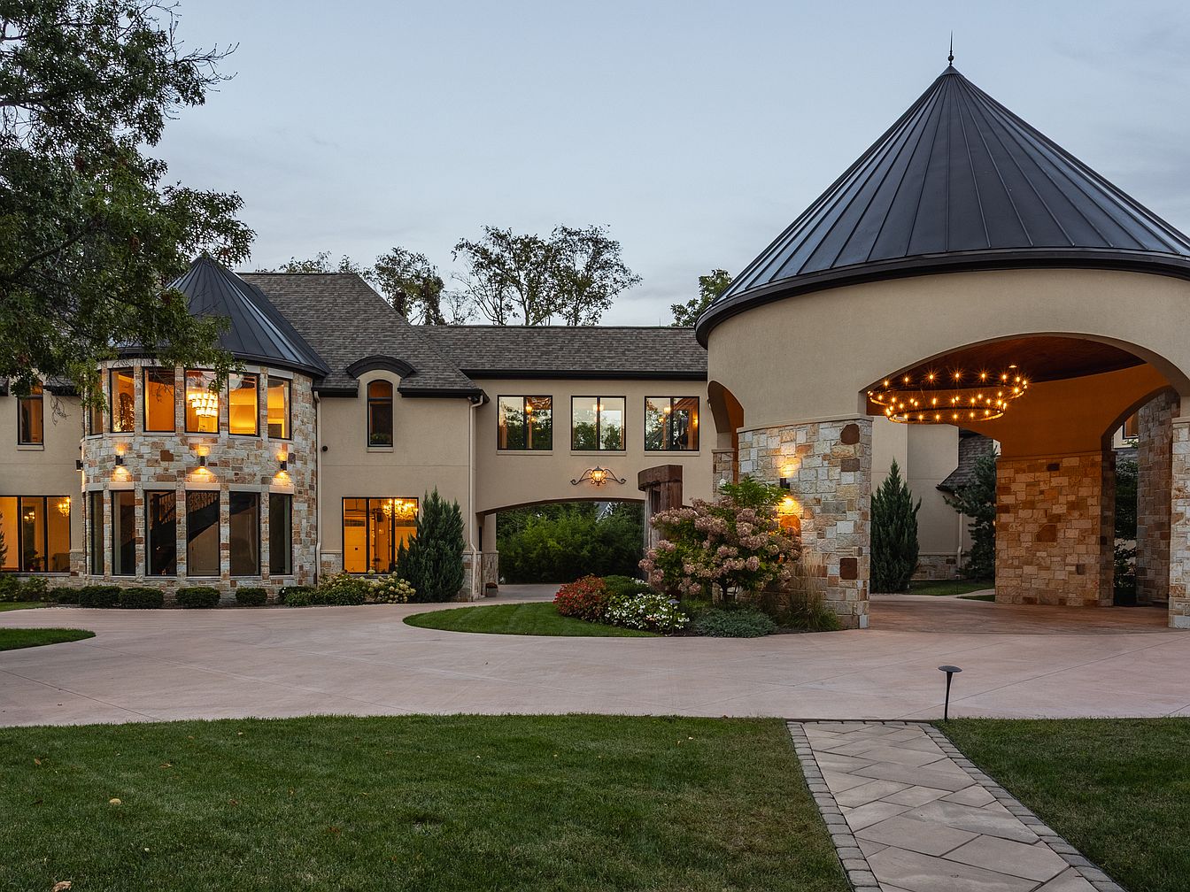 A stunning circular driveway leads up to a stately entryway framed by elegant stone pillars and a turret-style roof, setting an impressive tone for this American home. The facade blends warm neutral stucco with stacked stone accents, while ample windows allow golden light to spill out and illuminate the lush landscaping surrounding the entrance. The architectural design features a prominent covered carport with glowing chandeliers that create a welcoming ambiance, perfect for gatherings or family arrivals. Sweeping lawns and manicured flower beds provide space for children to play, making this picturesque exterior as inviting as it is sophisticated.