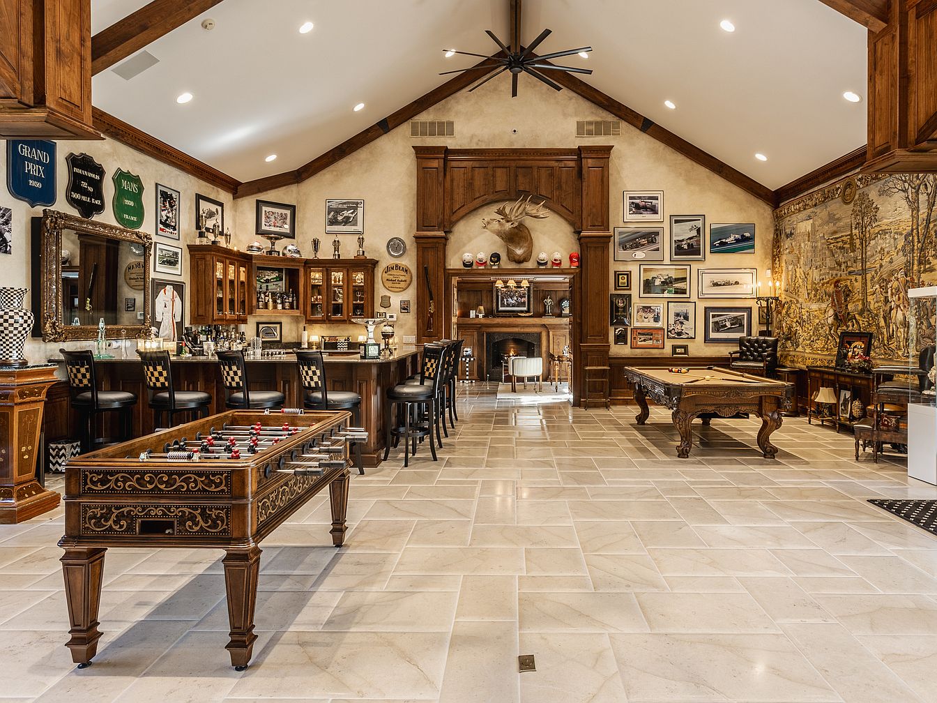 Offering a grand and inviting atmosphere, this spacious game room features rich wood cabinetry, vaulted ceilings with exposed beams, and elegant tile flooring for easy care and durability. A full bar with ample seating encourages social gatherings, complemented by a foosball and billiards table perfect for family fun. The decor highlights a passion for motorsports and classic Americana, with vintage signs, framed memorabilia, and a stately fireplace creating a cozy focal point. Warm, earthy tones and luxurious wood accents infuse the space with comfort and sophistication, while thoughtful wall art and comfortable seating make it ideal for entertaining all ages.