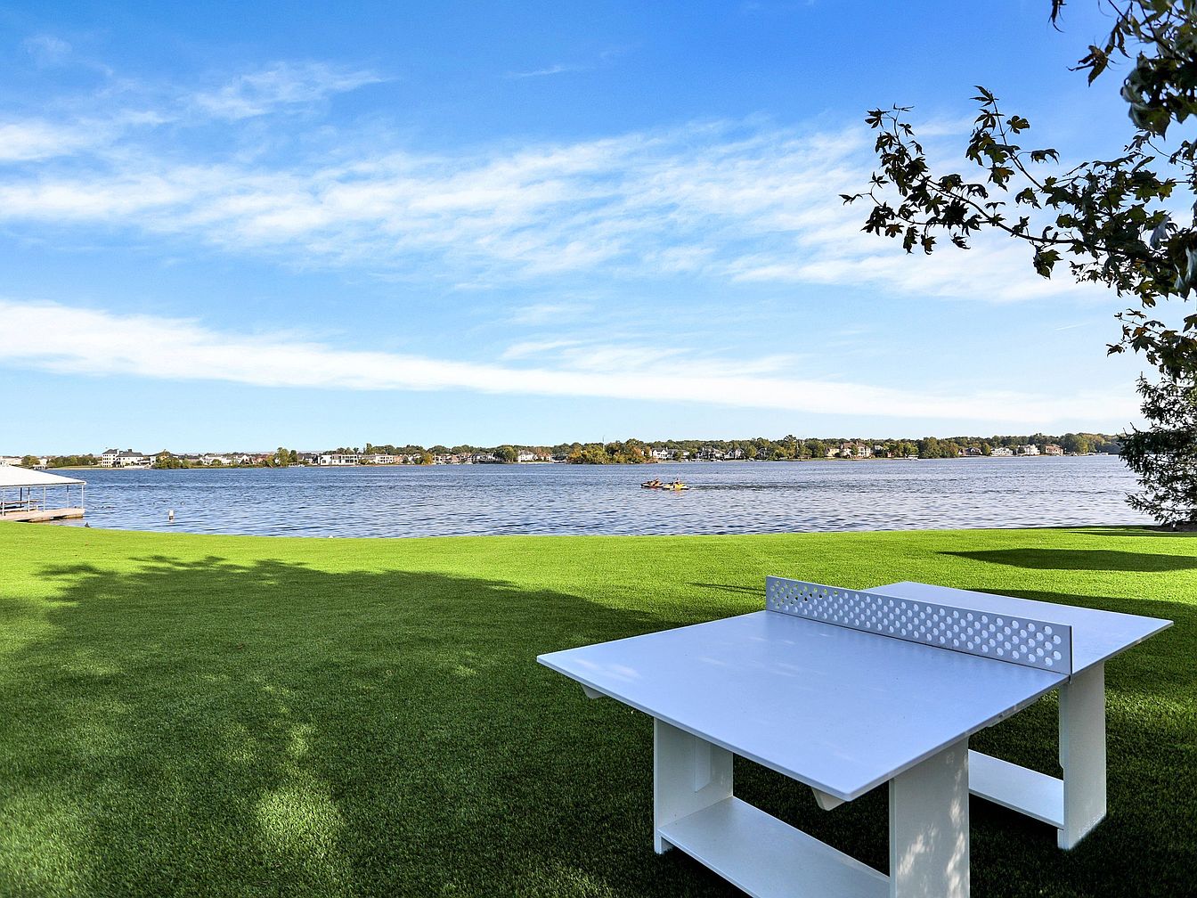 Expansive green lawn stretches toward a tranquil lakeshore, offering a peaceful and inviting outdoor retreat for family gatherings and recreation. A sleek, modern white ping pong table sits as a centerpiece, encouraging friendly competition and playful moments for all ages. The vibrant green of the neatly manicured grass harmonizes beautifully with the clear blue water and sky, creating a refreshing and energetic ambiance. Open space and minimal furniture make this setting ideal for children to run and play freely, while adults can relax and enjoy unobstructed lake views, making it perfect for both relaxation and family fun.