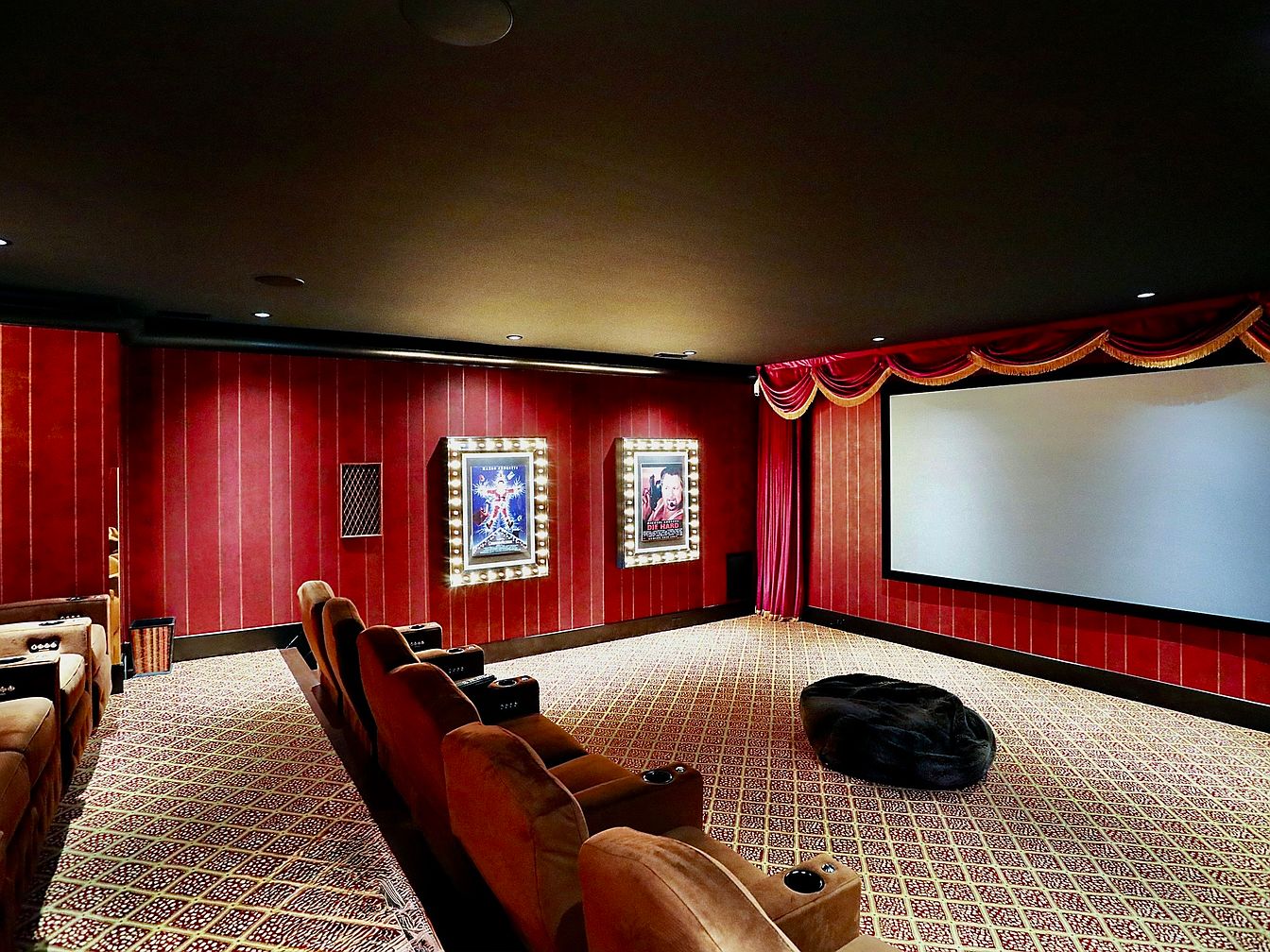 Step into a luxurious home theater designed for the perfect family movie night. Plush reclining seats are arranged in two rows for optimal viewing comfort, each with cupholders ideal for snacks and drinks. The deep red walls, adorned with golden pinstripes, evoke a classic cinema feel, while movie posters framed with glowing bulbs add Hollywood flair. A full-size screen is framed by velvet drapery with gold trim, providing an authentic theatrical vibe. The patterned carpet is soft and inviting, with a large bean bag chair at the front for kids to lounge. The space blends fun, elegance, and comfort for all ages.