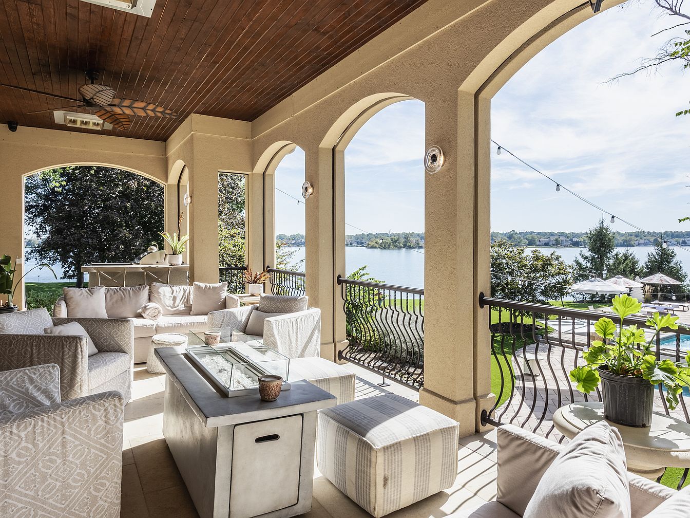 A spacious lakeside patio, perfect for family gatherings or entertaining friends, features plush cushioned seating and a cozy fire table as its centerpiece. The open layout encourages conversation, framed by grand stucco arches that let in natural light and offer unobstructed water views. Cream and beige tones create a serene, welcoming atmosphere, complemented by patterned chairs and textured poufs. Potted plants add life and color, while overhead fans and a rich wood ceiling lend a touch of classic elegance. The adjacent lawn and pool area are visible, making it easy for families to enjoy both indoor and outdoor spaces together.