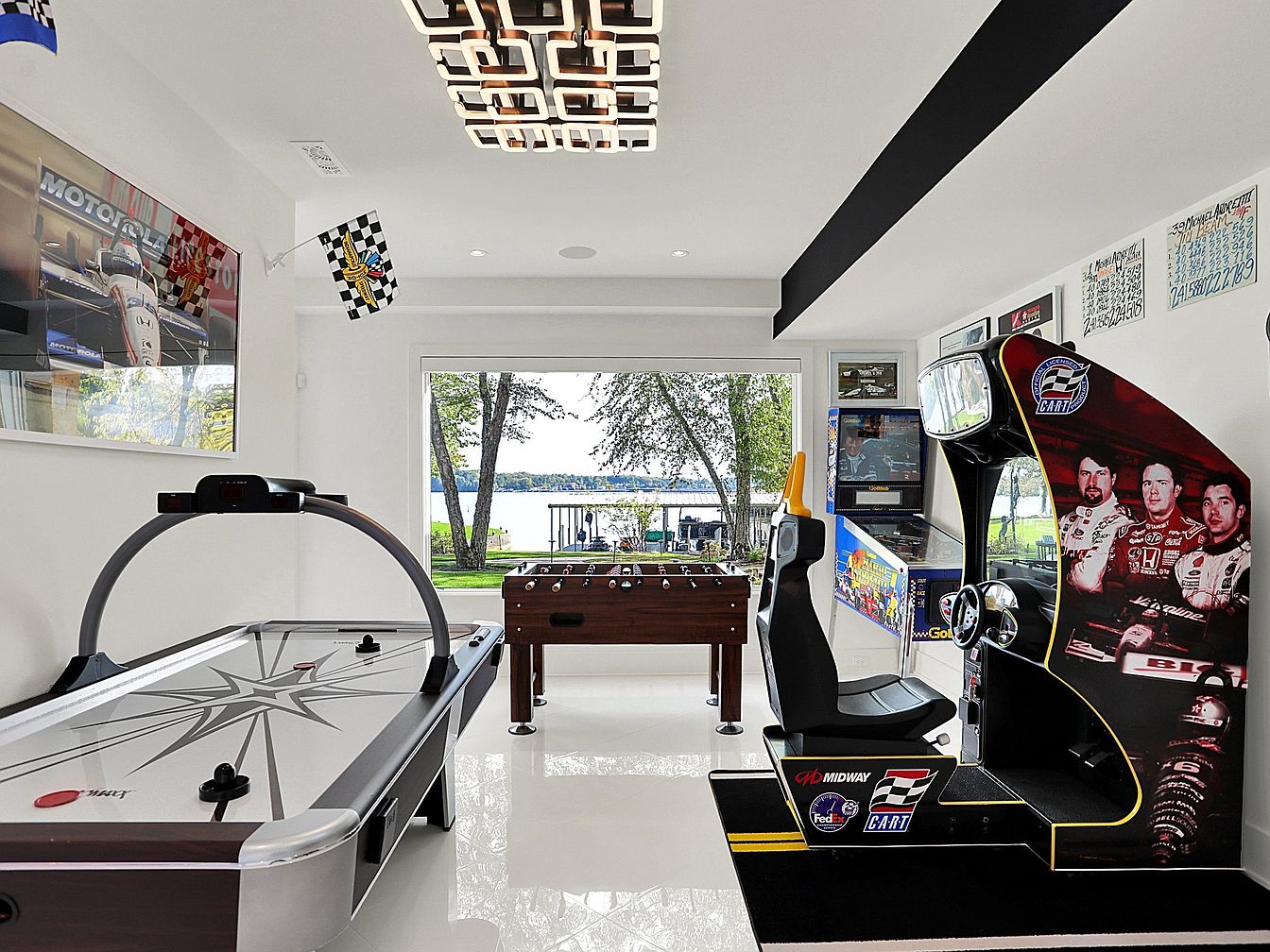 This vibrant and contemporary game room offers a playful atmosphere perfect for families and entertaining guests of all ages. The space is anchored by a sleek air hockey table, a foosball table, and a full-sized racing arcade game, providing hours of fun. Expansive windows invite natural light while giving a stunning lakeside view, seamlessly blending indoor excitement with outdoor serenity. The room’s crisp white walls and glossy floors are offset by dynamic racing décor, framed posters, and checkered flags, creating a cohesive, spirited look. Comfortable seating and open space ensure accessibility and enjoyment for everyone.