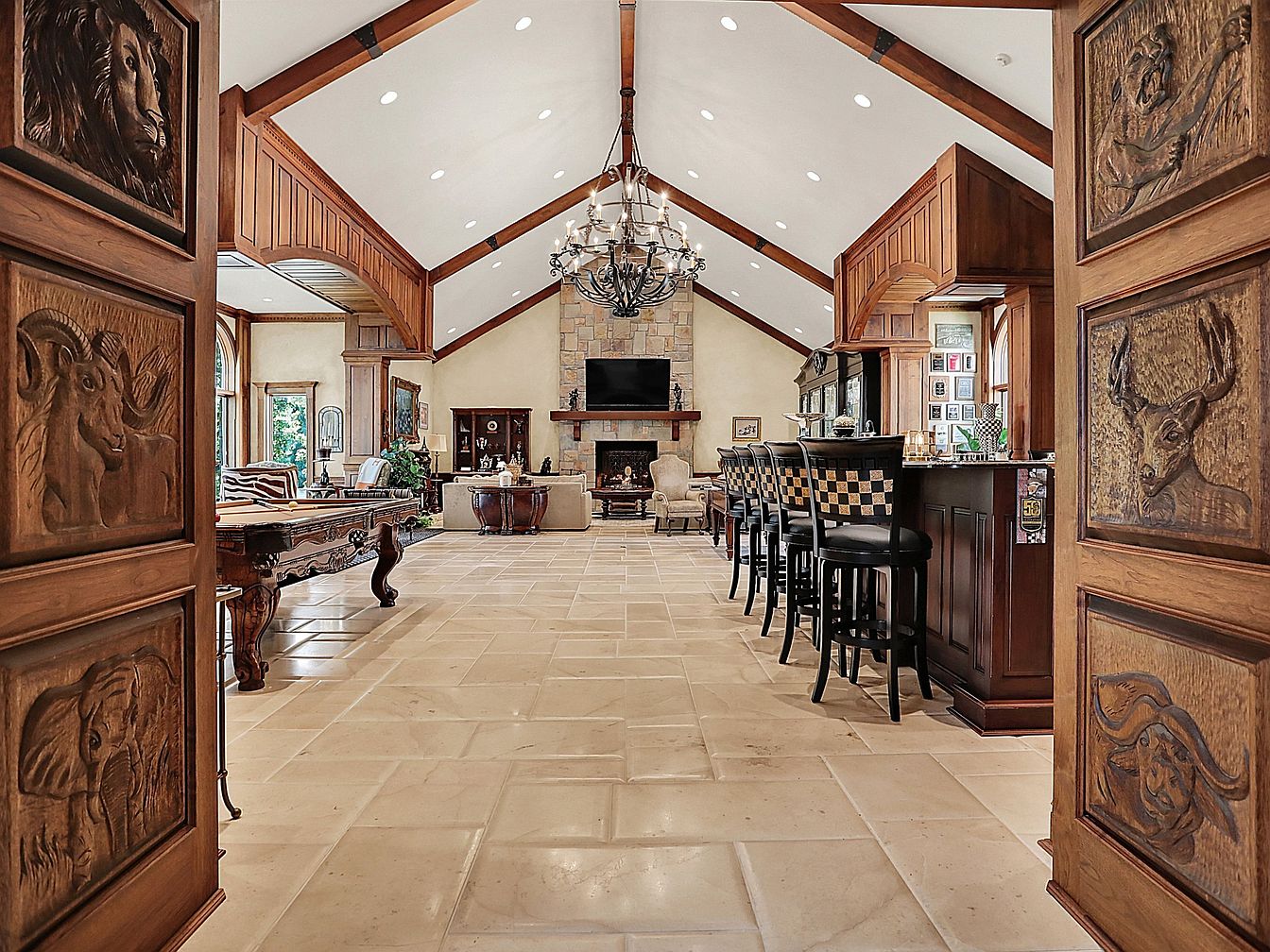Grand double doors adorned with intricate wildlife carvings open to a spacious family game room featuring vaulted ceilings with exposed wood beams and recessed lighting. The stone fireplace forms a cozy centerpiece flanked by plush sofas, perfect for gatherings. A long counter with elegant high-backed barstools adds a casual entertaining spot, while a billiards table hints at family fun. Warm earth tones dominate the palette with creamy marble floors, rich wooden cabinetry, and ample natural light streaming through generous windows. The open layout provides plenty of room for activities and relaxation, making it both inviting and practical for families.