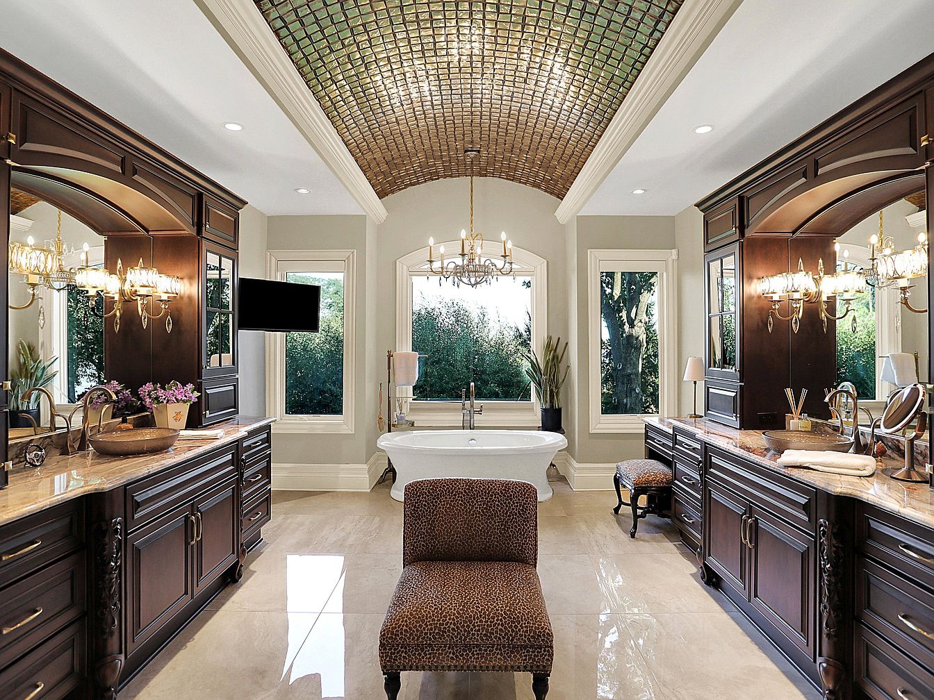 A spacious master bathroom exudes elegance with its symmetrical double vanity layout, anchored by a freestanding soaking tub beneath three expansive windows that invite natural light and scenic garden views. Rich dark wood cabinetry and marble countertops create a sense of timeless luxury, while gold-toned fixtures and ornate chandeliers add sophisticated warmth. The ceiling stuns with a barrel-vaulted, mosaic tile inlay, providing a dramatic visual focal point. Thoughtful seating areas, ample countertop space, and dual mirrors offer family-friendly convenience for busy mornings or serene evenings. Soft, neutral tile floors and plush upholstery complement the calming, upscale ambiance of this relaxing retreat.