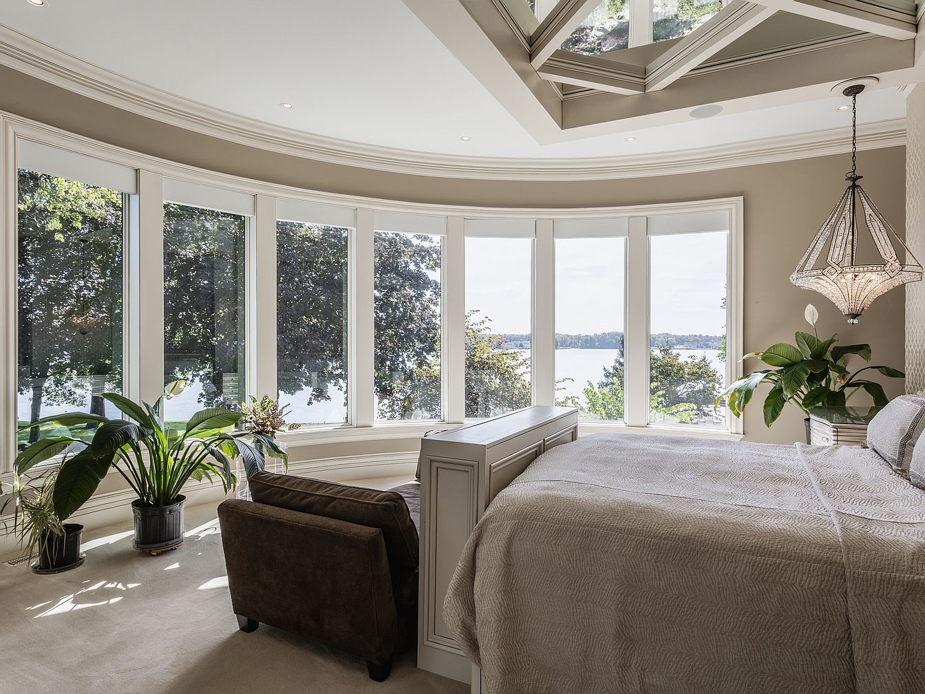 This serene bedroom features a breathtaking curved wall of floor-to-ceiling bay windows, offering sweeping views of a tranquil lake and lush greenery. The inviting layout is anchored by a cozy upholstered bed placed to maximize the scenery, while plush carpeting underfoot adds warmth and comfort—ideal for family relaxation. Soft beige walls and linens create a soothing color palette, complemented by natural light streaming through the large glass panels. Potted plants add a lively, fresh touch and promote a calming atmosphere. Elegant architectural details, such as the coffered ceiling and ornate pendant light, lend sophistication to this restful retreat.