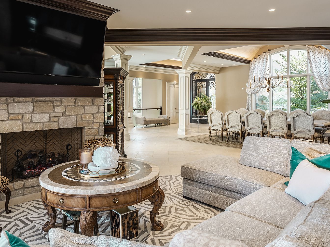 Spacious open-concept living room seamlessly flows into an elegant dining area, perfect for family gatherings and entertaining. A large sectional sofa with plush neutral upholstery and teal accent pillows invites cozy relaxation around a striking stone fireplace, topped by a wall-mounted television. The traditional wooden coffee table adds warmth, while the patterned rug introduces subtle texture. The dining space features an extended table surrounded by ornate, upholstered chairs beneath a grand chandelier, bathed in natural light from arched windows framed by patterned drapes. Soft beige walls, detailed crown molding, and tiled floors complete the inviting, sophisticated ambiance.