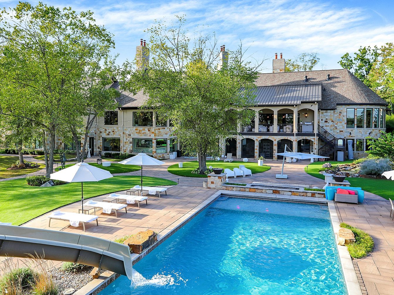 A luxurious backyard oasis blends sophisticated living with family-friendly outdoor fun. The expansive pool features a built-in slide for children, surrounded by neatly manicured lawns and lounging areas topped with crisp white umbrellas. Modern, comfortable lounge chairs line the water, inviting relaxation in the sun. The grand home’s stone exterior, large windows, and elegant covered terrace provide a perfect backdrop for gatherings and alfresco dining. Mature trees add natural shade, while playful features like a large swing and colorful patio seating make the space perfect for both adults and kids to enjoy, making it ideal for entertaining or peaceful retreat.