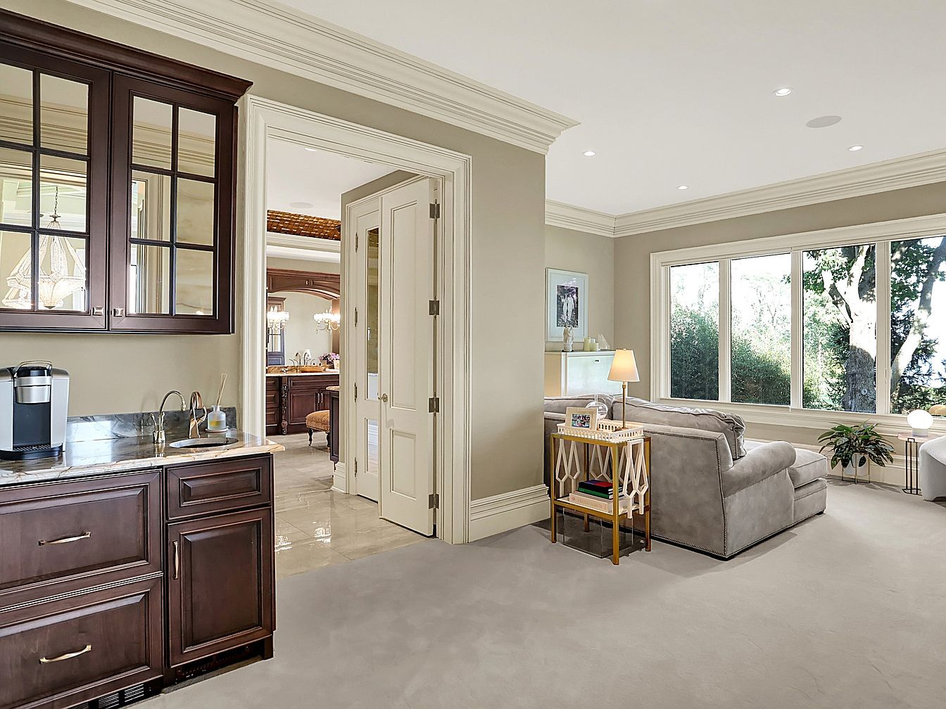 Spacious and inviting, this open living area seamlessly connects the lounge and a kitchenette, creating a perfect spot for families to gather or entertain guests. Soft beige carpeting pairs with taupe walls, highlighted by detailed crown molding, for an elegant yet comfortable ambiance. Large windows flood the space with natural light and offer tranquil views of greenery outside, while plush sectional sofas provide cozy seating for family movie nights or casual conversations. The mini kitchenette boasts sophisticated dark wood cabinetry, marble countertops, and upscale fixtures, blending functionality with classic style. Thoughtful touches like houseplants and subtle art pieces enhance the homey, welcoming atmosphere.