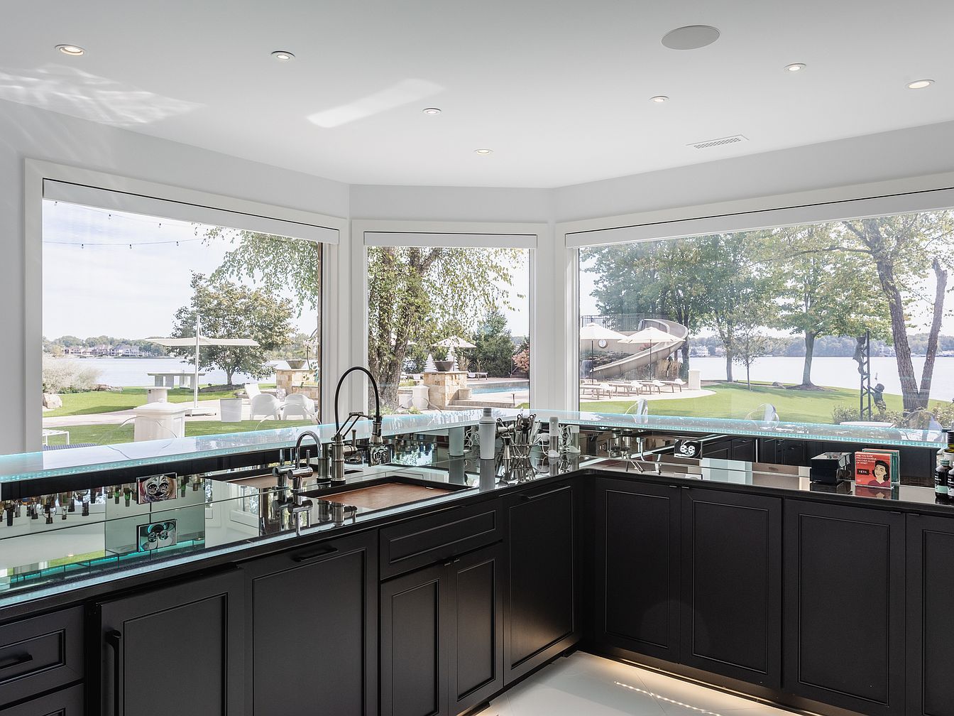 This stunning home bar area boasts expansive picture windows that flood the space with natural light and offer breathtaking views of the backyard, lush lawn, and sparkling lakeside beyond. Dark cabinetry and sleek black countertops provide a sophisticated contrast to the crisp white walls and ceiling. The glass shelving and mirrored backsplash lend a touch of elegance while maximizing light and space. Family-friendly outdoor features such as comfortable patio seating, a water slide, and open grassy areas make entertaining both stylish and practical. The seamless indoor-outdoor connection makes this corner perfect for gatherings and relaxed living.