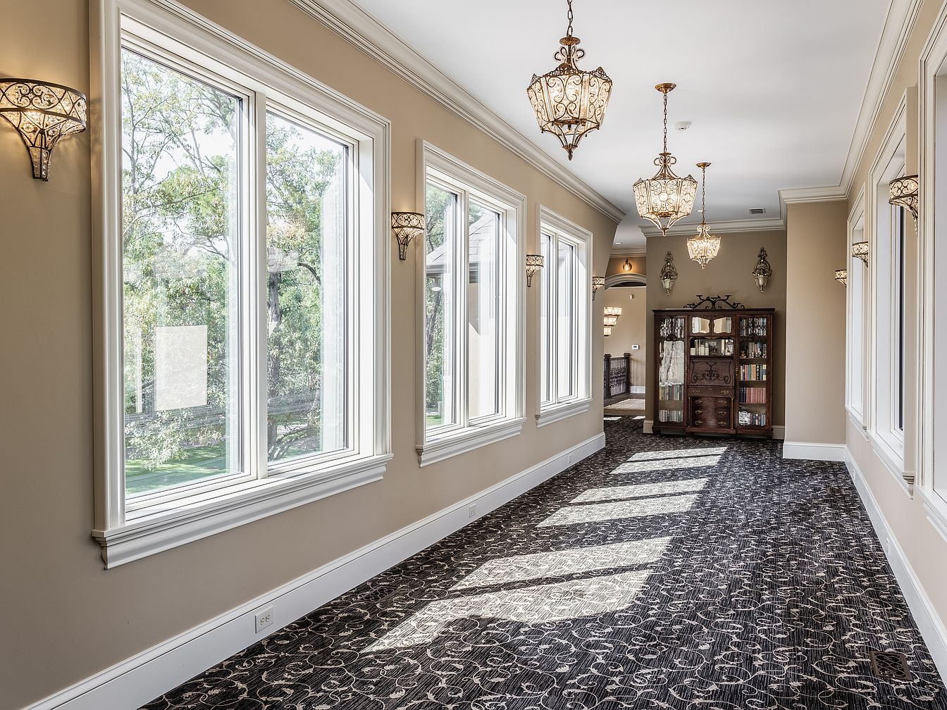 An inviting hallway bathed in natural light from a series of large, elegant windows lining both sides, creating a bright and airy passageway perfect for family movement and play. The space is anchored by an ornate, patterned dark carpet that adds sophistication while hiding footprints, making it child-friendly. Classic beige walls are accented by white crown molding and adorned with decorative sconces and vintage pendant lighting overhead, blending warmth and timeless style. At the far end, a glass-fronted wooden bookcase houses cherished books and decor, providing a cozy reading nook or study spot ideal for both adults and children.