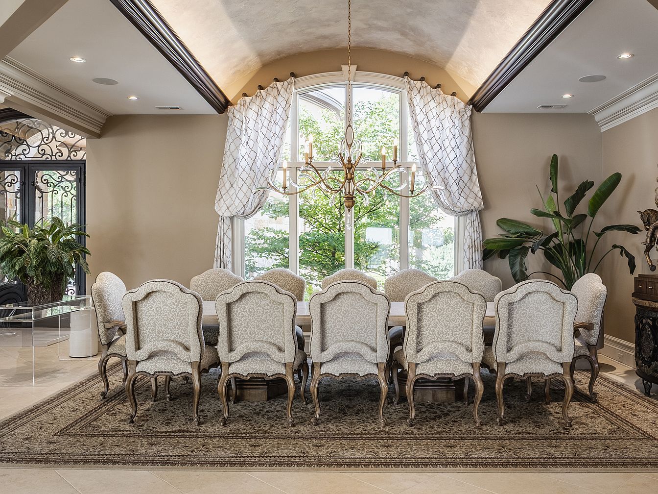 A grand dining space filled with natural light from large arched windows, framed by elegant draped curtains. An expansive dining table is surrounded by ten classic upholstered chairs, making it ideal for family gatherings or entertaining guests. Soft beige walls pair with intricate crown moldings and a vaulted ceiling, creating an atmosphere of sophistication. The area is anchored by a traditional patterned rug, while lush indoor plants introduce a touch of greenery for warmth and life. A stylish chandelier hangs above the table, providing soft ambient lighting that enhances the inviting, family-friendly setting.