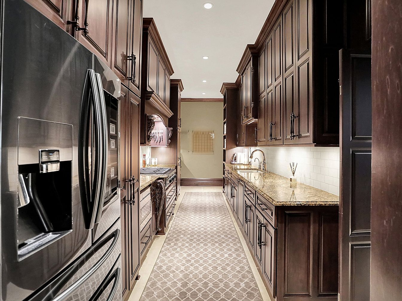 This galley kitchen features rich, dark wood cabinetry paired with elegant granite countertops, creating a warm and sophisticated atmosphere. The classic subway tile backsplash and ample overhead and under-counter storage make this space both practical and visually pleasing. Modern stainless steel appliances lend a sleek, contemporary touch, while the patterned runner rug softens the space and adds comfort underfoot, a family-friendly feature for busy mornings. Thoughtful lighting, including recessed ceiling lights, ensures excellent visibility. The layout offers optimal efficiency for meal preparation, with easy access to all essentials, making it an inviting spot for family cooking and everyday living.